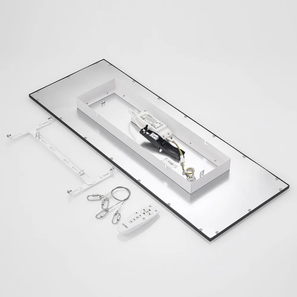 Rektangulær Nelios LED-loftlampe med praktiske funktioner Nelios er ikke kun et minimalistisk LED-panel, men har også praktiske funktioner, der gør panelet til en praktisk følgesvend, når det gælder belysning af indendørs områder. Lampekroppen er lavet af sort aluminium og en hvid diffusor af plast, bag hvilken der er skjult permanent installerede LED’er. Disse LED’er kan dæmpes trinløst (10-100 %), og deres lysfarve kan styres (2.700 K, 4.000 K og 6.500 K) ved hjælp af en almindelig vægkontakt eller den medfølgende fjernbetjening. Nelios LED-loftlampen har også en hukommelsesfunktion, der kan bruges til at genkalde tidligere indstillede tilstande, når lyset tændes igen.