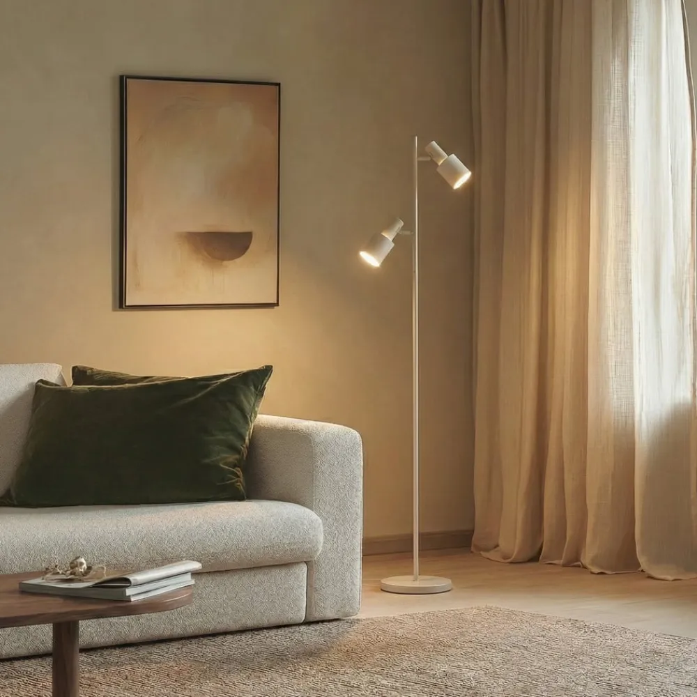 Smal Ovelia gulvlampe med to justerbare skærme Ovelia gulvlampen er en smuk lyskilde, som kan bruges i mange forskellige sammenhænge. Uanset om det er i arbejdsværelset eller i stuen, skaber denne lampe en inspirerende atmosfære. Med sit iøjnefaldende design og sin diskrete farve er den et statement og et blikfang i ethvert rum. De to lampeskærme er justerbare, så vinklen på det udsendte lys kan tilpasses. Ovelia tændes og slukkes ved hjælp af fodkontakten, der er integreret i kablet.