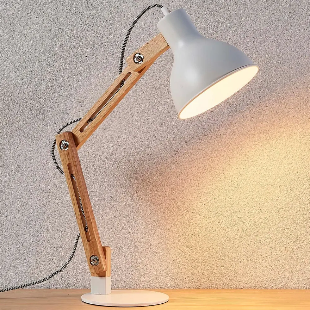 Lindby Arbejdsrum/Kontor|Pendellamper>Træ-skrivebordslampe Shivanja med hvid skærm