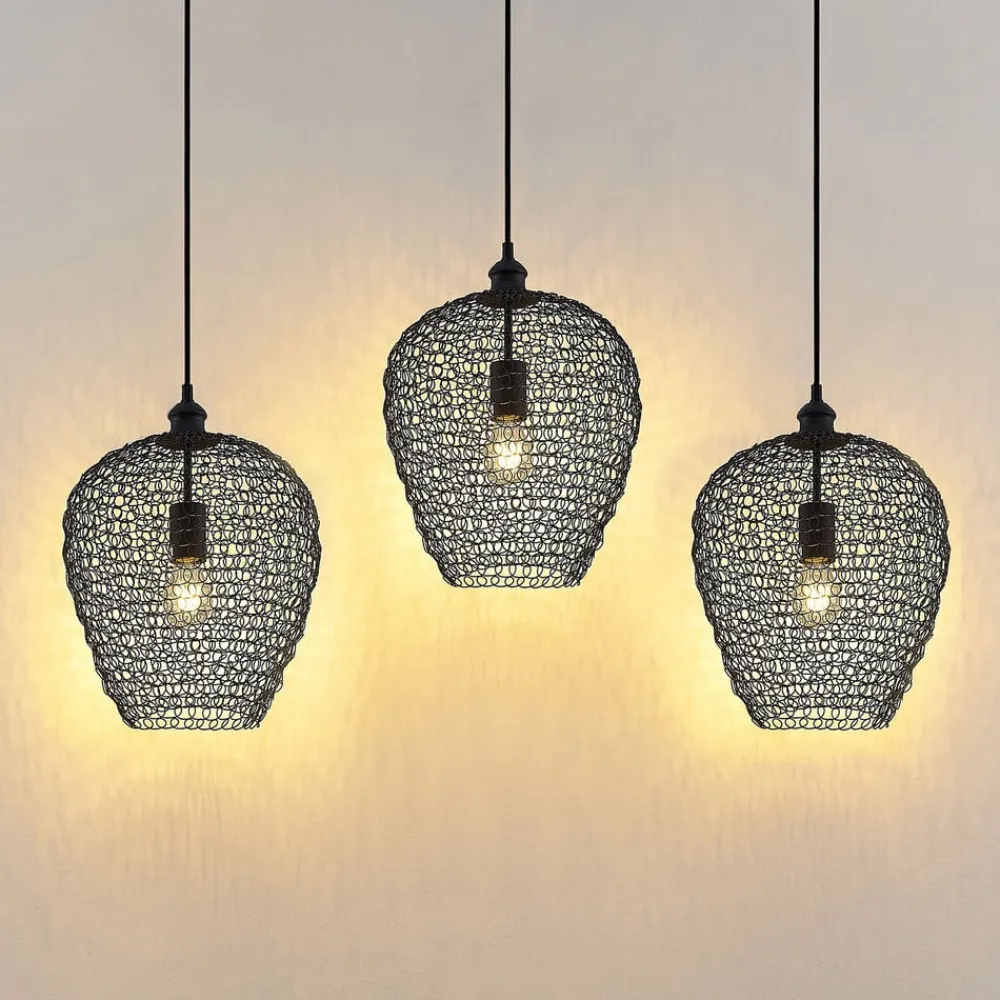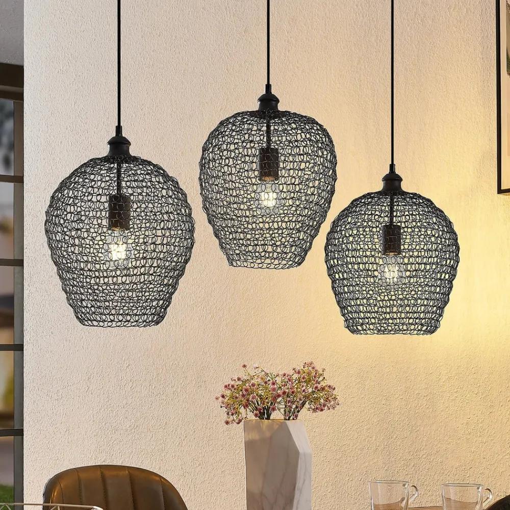 Benja har tre lampeskærme, der ikke er klassisk formede, men er lavet af finmasket metal og er ret gennemsigtige. Så du kan stadig se lyskilden godt og bør vælge den, så den ser dekorativ ud og passer til det overordnede udseende. Lyseffekterne er hyggelige og individuelle, et smukt spil med fine skygger og lyssekvenser dannes i rummet, hvilket pænt understreger hygge. Med den aflange form med tre pendellampe særligt velegnet til bordbelysning i spisepladsen.
