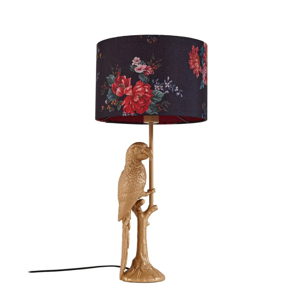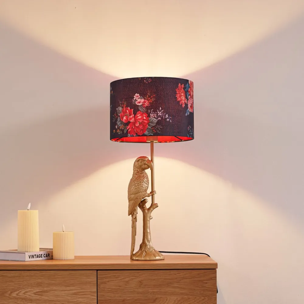 Bordlampen Marula kombinerer kunstfærdigt materialerne kunstharpiks og tekstil for at skabe et unikt udtryk. Med sit iøjnefaldende blomsterprint og den interessante farvekombination i guld, sort og rød bliver den et stilfuldt blikfang i ethvert rum. Kombinationen af moderne design og klassiske elementer gør denne lampe til et alsidigt tilbehør, der skaber en varm og indbydende atmosfære i både stuen, spisestuen og soveværelset.