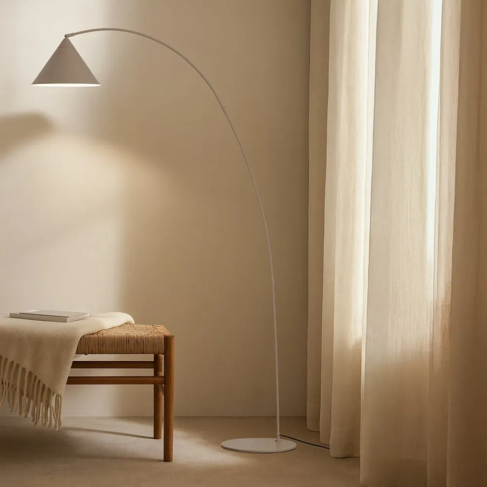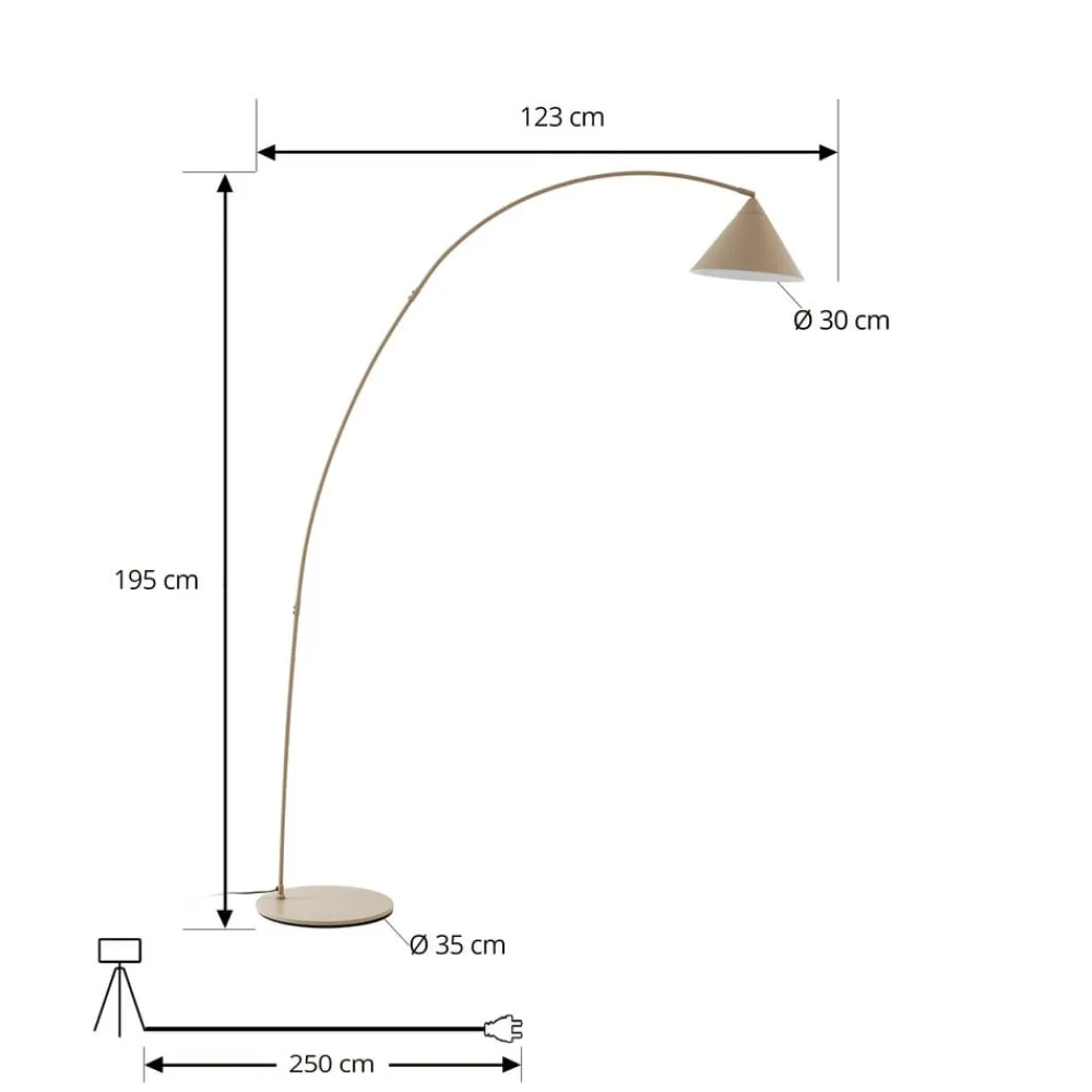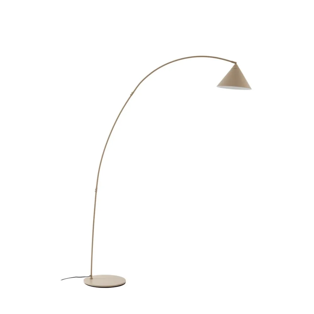 Lindby gulvlampe Triangolo i naturlig beige kombinerer moderne design med praktisk fleksibilitet. Den er fremstillet af metal i høj kvalitet og passer perfekt ind i moderne stuer og tilbyder en stilfuld belysningsløsning. Den diskrete farvekontrast mellem beige og den hvide inderside af den kegleformede skærm skaber et behageligt lys, der stråler nedad.