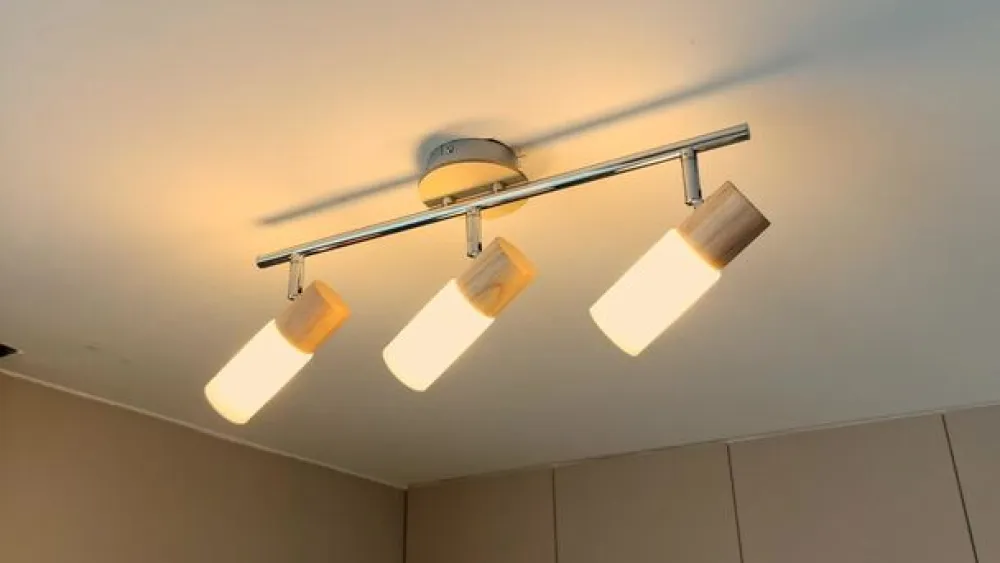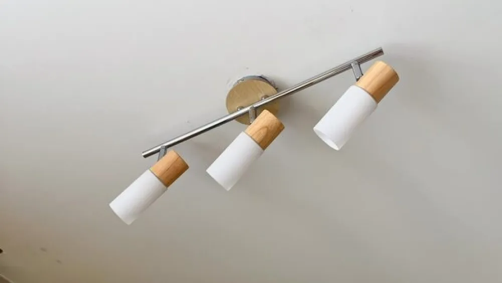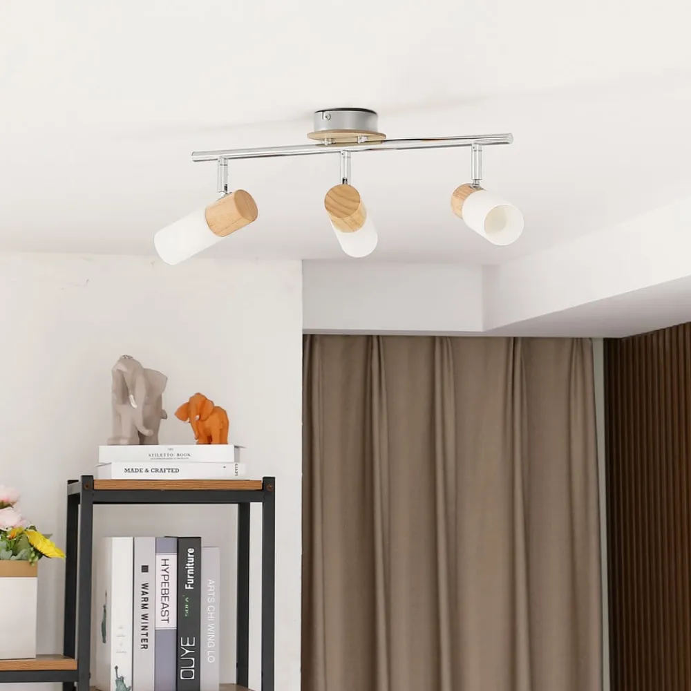 De smalle, cylindriske skærme på denne spot kan drejes og drejes, da de er fastgjort til rammen med led. Lyset kan derfor rettes efter behov, og det hvide glas giver altid et behageligt, blødt lys med et hjemligt præg. Dette indtryk understreges smukt af de træelementer, der dekorerer overgangen mellem skygge og ramme