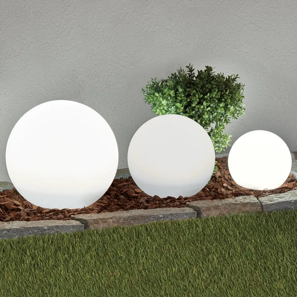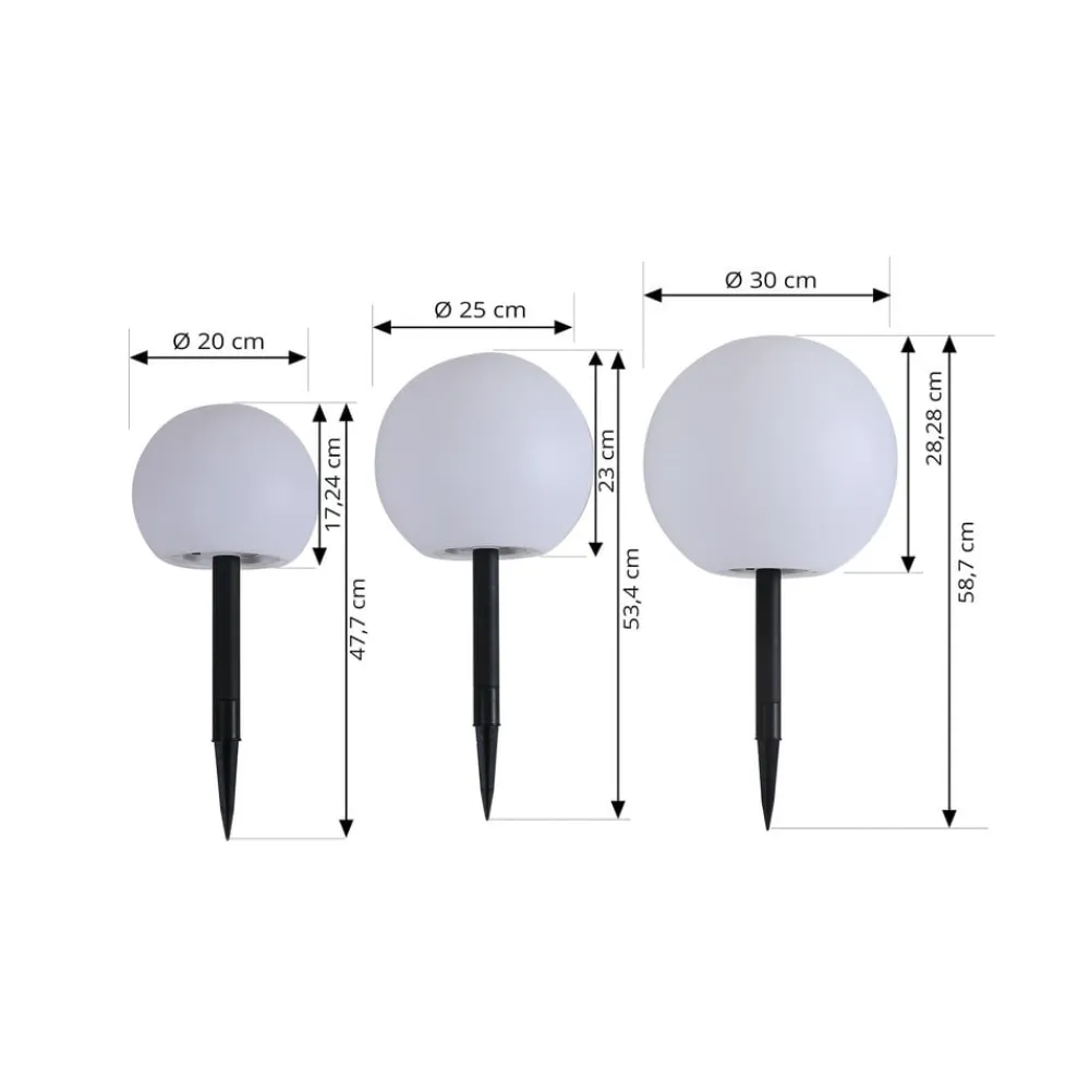 Tre lysende kugler til haven: Lago LED-solcellelamper i et sæt Dette sæt med 3 er en god anbefaling til alle husejere med en have eller dem, der ønsker at opgradere deres blomsterkrukker på altanen eller terrassen. Sættet med 3 stk. indeholder tre kugler i forskellige størrelser med en diameter på 20 cm, 25 cm og 30 cm, som alle har et jordspyd. Alene de forskellige diametre kan skabe særlige visuelle effekter, men det er selvfølgelig kuglernes oplyste funktion, der sætter alting i relief og giver et forførende syn, ikke kun på en varm sommeraften. LED’erne lyser alene ved hjælp af solenergi; der er ikke brug for strøm fra stikkontakten. Det gør det også muligt at placere dem, hvor man vil. Det eneste krav er, at der skal være tilstrækkeligt med sollys i løbet af dagen, så LED-panelerne, som er usynligt placeret inde i kuglerne, kan lade ordentligt op.