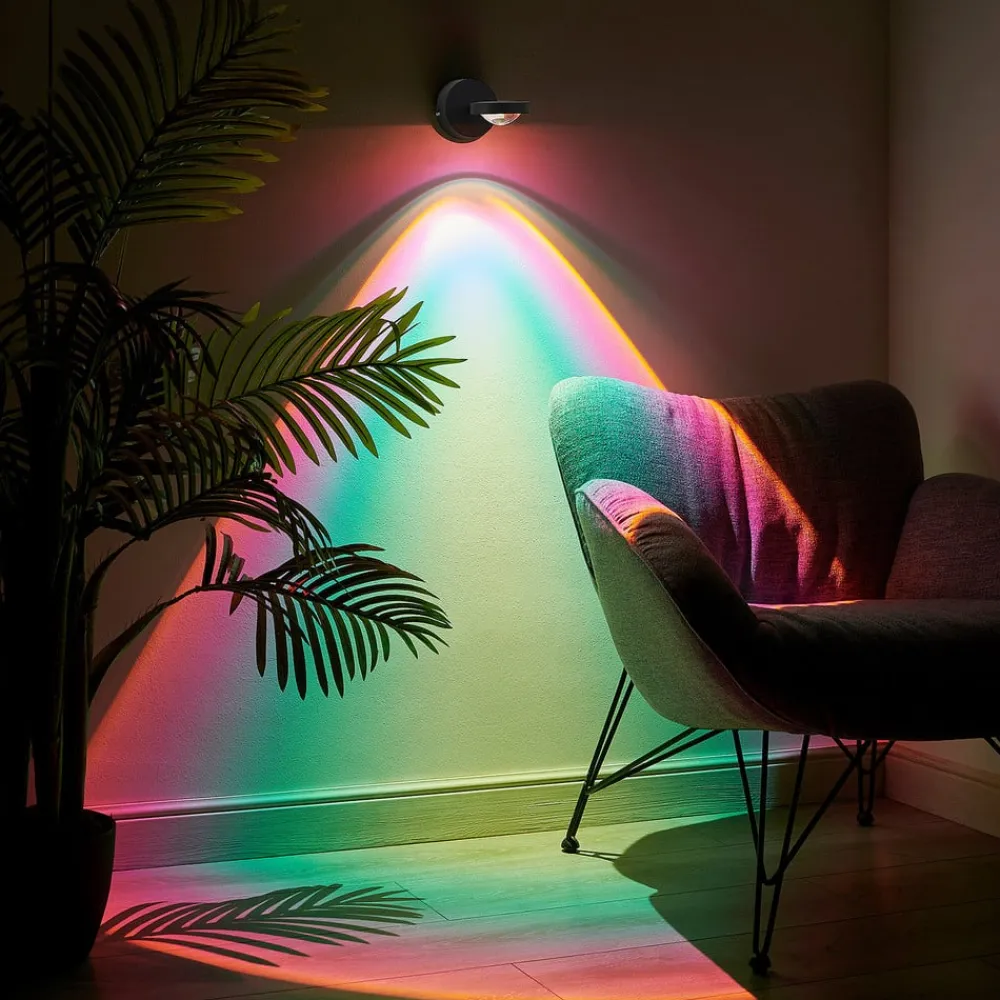 Denne LED-væglampe har et sort metalhus og en glaslinse, der giver et skarpt kontureret lys. På denne måde skabes smukke accenter med farvede effekter, som er meget seværdige. Da lygtehovedet er drejeligt, kan du selv bestemme, i hvilken retning lyset skal pege. På væggen afspejles dette på en meget smuk måde, som er meget attraktiv og synlig på afstand.