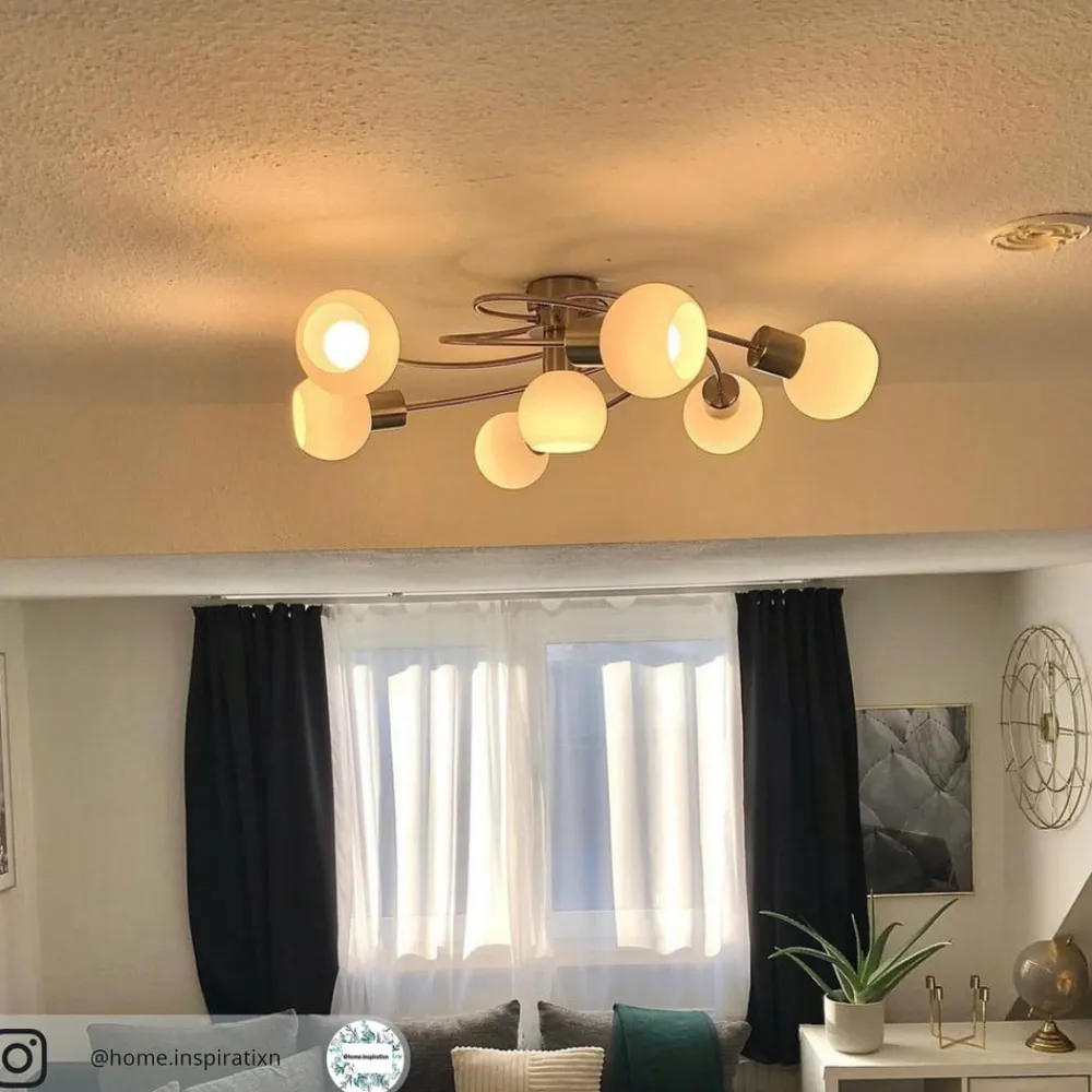 Ciala – 7 lyskilder til E14-lamper i et æstetisk formsprog Denne loftlampe er særligt velegnet til at oplyse større rum, da de syv lyskilder sikrer en god lysstyrke. Mens en af skærmene af hvidt glas sidder direkte i midten af armaturet, er de andre forbundet med midten via buede lampearme og strækker sig ud mod armaturets yderkant. Man kunne næsten tro, at armaturet drejer rundt – en optisk illusion, naturligvis – for Cialas udtryk er meget dynamisk, hvilket naturligvis er en af grundene til, at det kan kombineres meget godt med moderne boligstile.