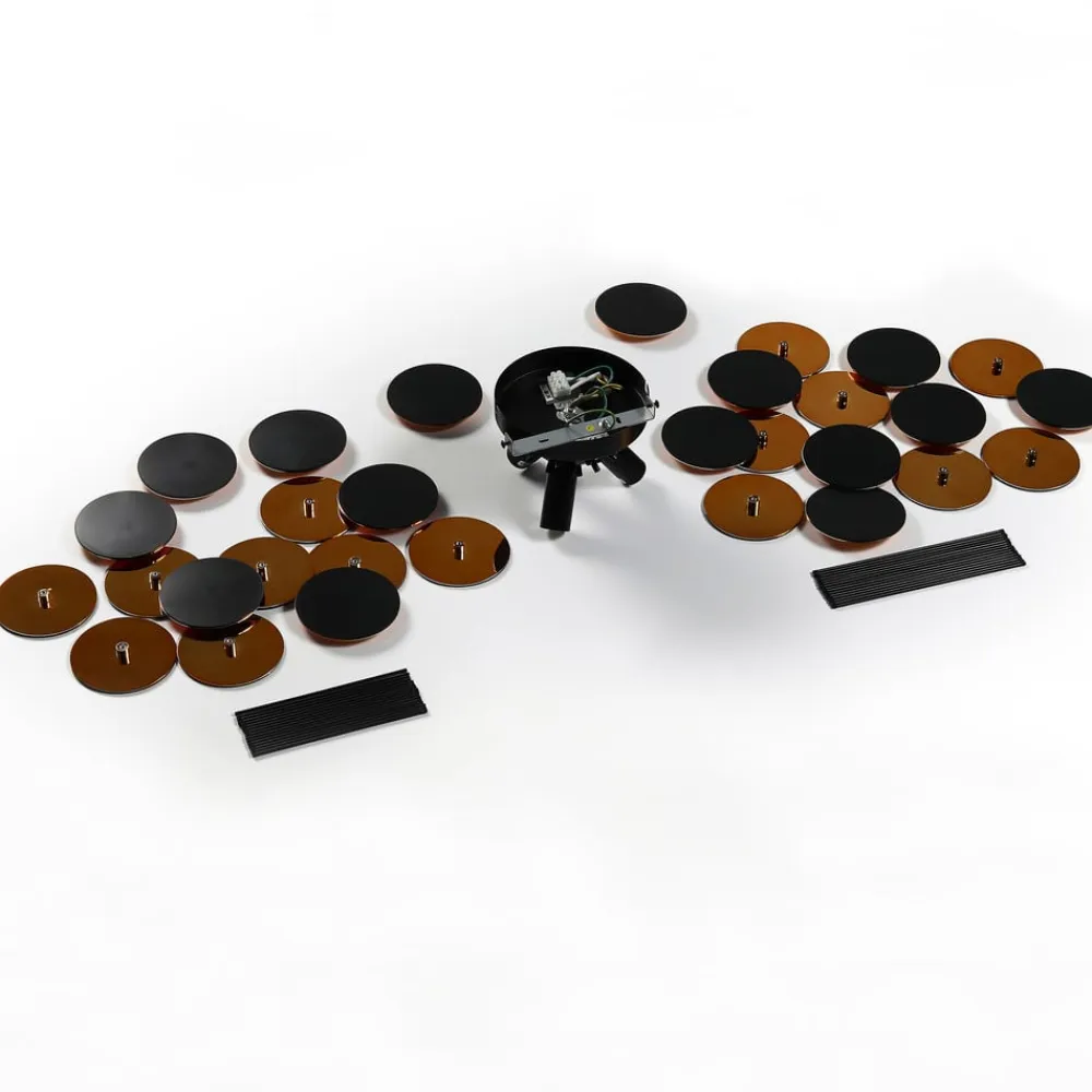 Trendy Kinan loftlampe med sorte og gyldne plastskiver Nogle lamper har konventionelle skærme, som har eksisteret siden den elektriske belysnings begyndelse, men denne loftlampe er ikke en af dem, fordi strukturen, der passer rundt om pærerne, består af mange runde skiver, der er sorte på ydersiden, men malet guld på indersiden. Der er plads nok mellem dem til, at lyset kan trænge ind i rummet, og den visuelle effekt af cirkler og mellemrum afspejles selvfølgelig også i rummet, hvor man kan se lys og skygge på samme tid, når loftlampen er tændt. Den guldfarvede inderside får lyset til at virke varmere, hvilket naturligvis bidrager til en højere hyggefaktor.
