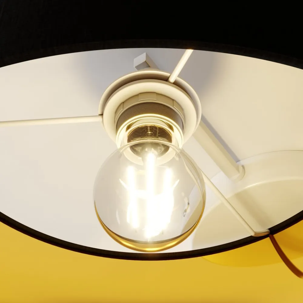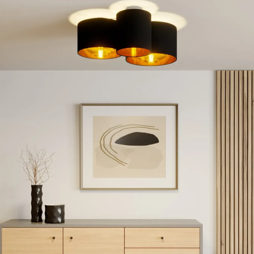 Laurenz loftlampe med tre runde lampeskærme i stof – sort på ydersiden, gylden på indersiden Laurenz er en hyggelig lyskilde, der med sit sort-guld farveskema er med på en smuk trend. Loftlampens lampeskærme har en tekstiloverflade i mat sort, mens der på indersiden er en skinnende folie i en varm guldtone, der reflekterer lyset på en vidunderlig hyggelig måde. Loftlampen kan bruges i alle tænkelige private rum, fra stuen til gangen til soveværelset, men den er også velegnet til stilfuld belysning af et kommercielt miljø, for eksempel i en restaurant. Lyskilderne kan vælges frit, og markedet tilbyder nu et meget bredt udvalg, hvor der primært anbefales effektive LED-pærer, som også fås i det smukke filamentpære-look, der repræsenterer det klassiske pære-look. Dæmpbare lamper eller dem med en ekstra varm lysfarve er også et godt alternativ til det varmt tonede overordnede design for at gøre stemningen endnu hyggeligere.