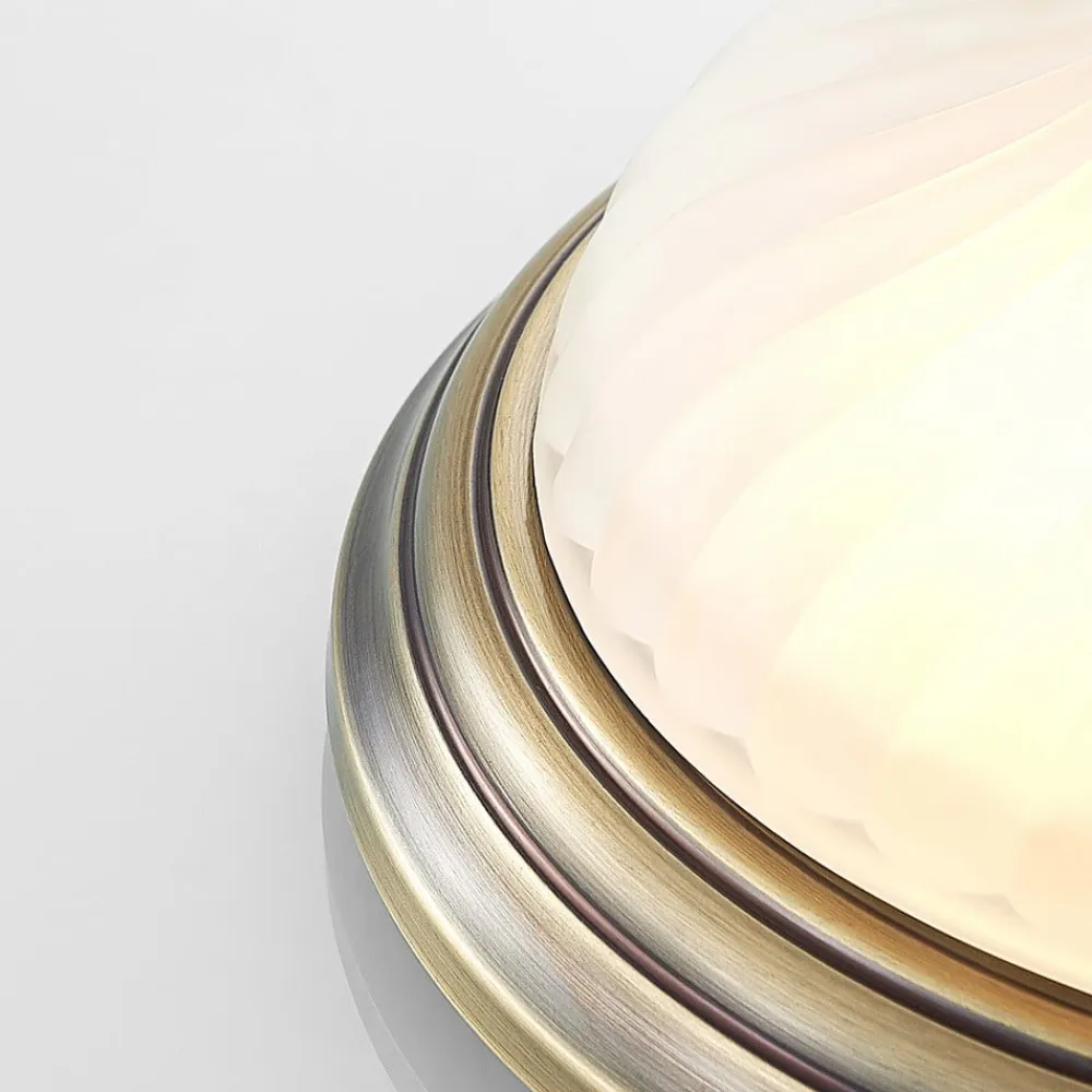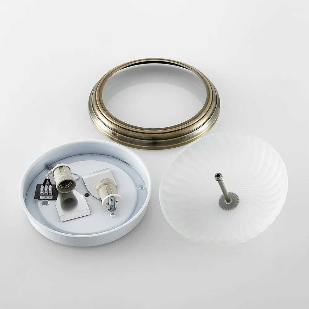 Pakka loftlampe med metalhus i messinglook Denne interessante lyskilde har en diskret, men alligevel meget speciel effekt på beskueren. Den enkle lampeskærm på Pakka loftlampen er lavet af matteret glas, som fordeler lyset blidt og blændfrit i hele rummet. Den robuste metalramme har et antikt messinglook, som giver Pakka en særlig karakter. De to E27-fatninger kan monteres med både normale og dæmpbare pærer. Kombineret med en almindelig vægdæmper (dæmper eksklusiv) kan lysstyrken på denne smukke lampe justeres, så den passer til dine egne behov.