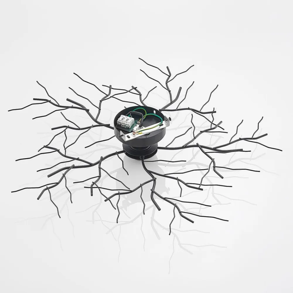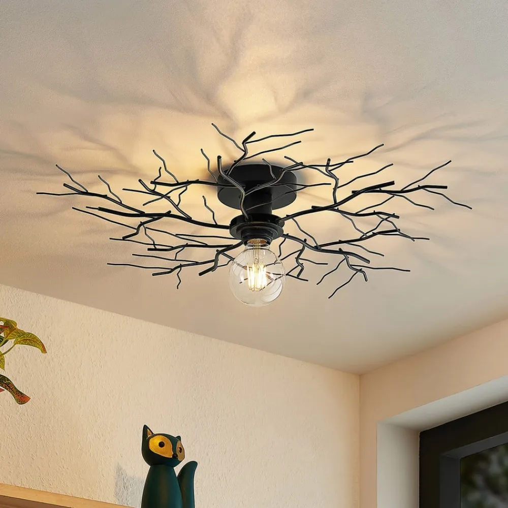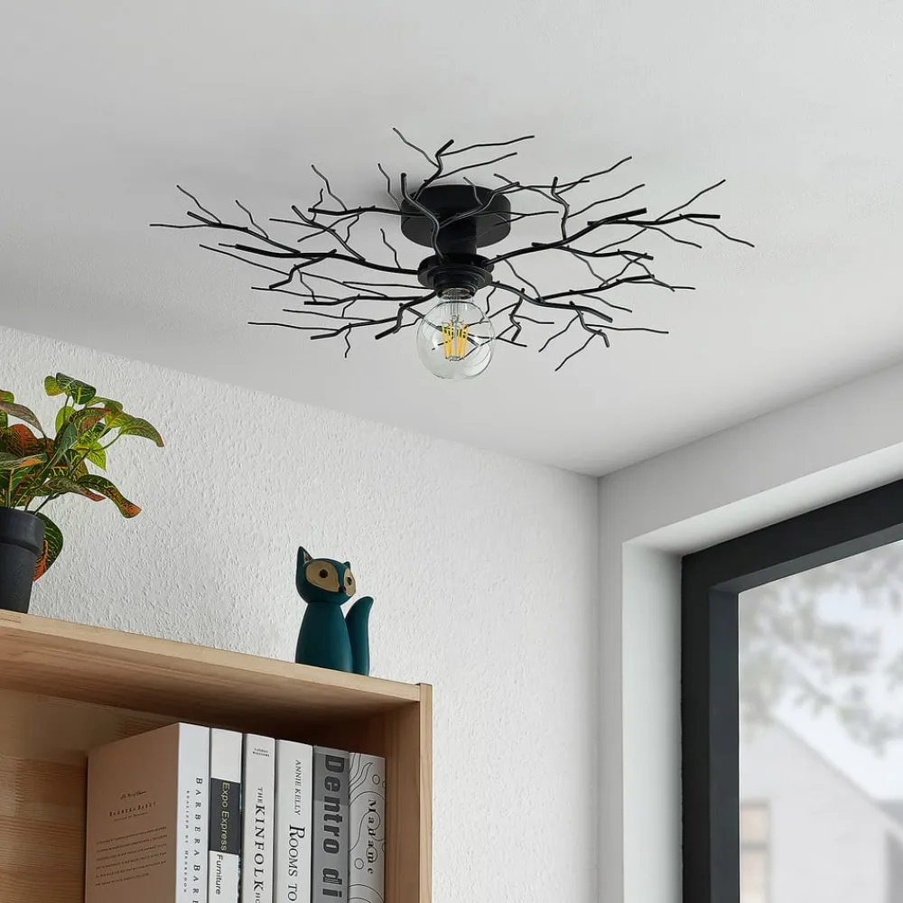 Vetki loftlampe i et usædvanligt design Denne smukke loftlampe imponerer med et særligt look, der er umiddelbart tiltalende. Man har undladt en klassisk lampeskærm, så man har frit udsyn til den pære, der skal bruges. Derfor skal den vælges med omhu og understrege armaturets dekorative karakter. Fokus i dette design er den fremspringende jerndekor, som minder om mange forgrenede grene i en abstrakt form og dermed bringer et naturligt element til dette armatur.