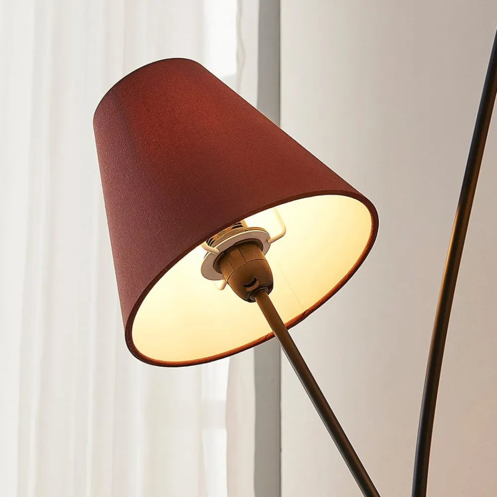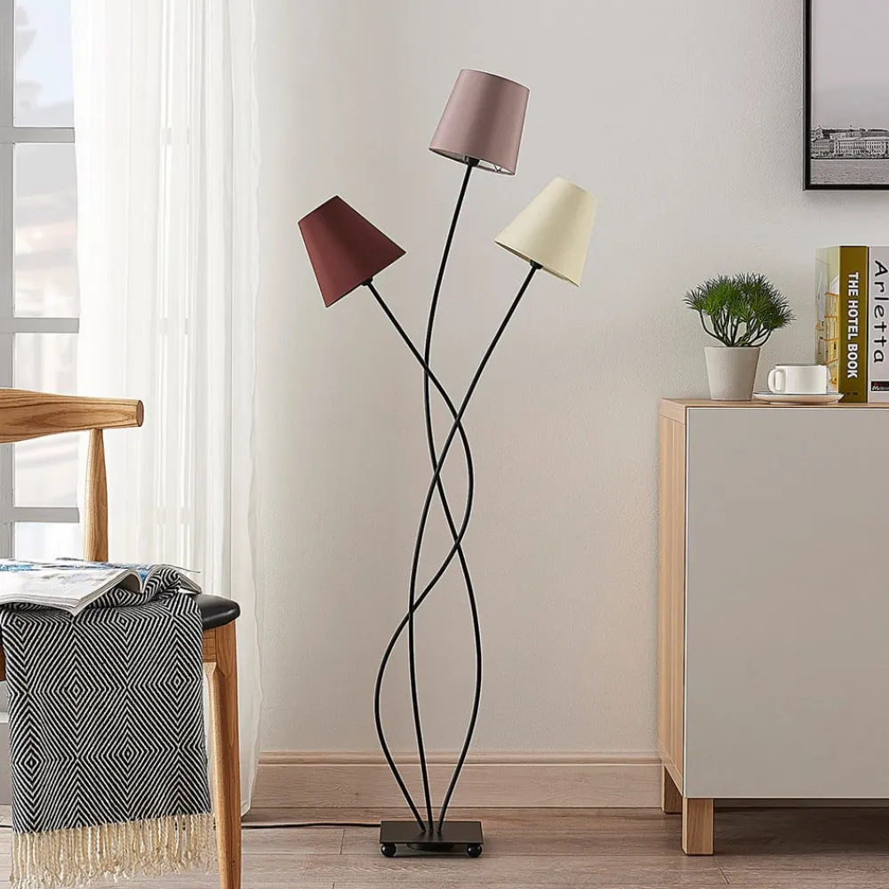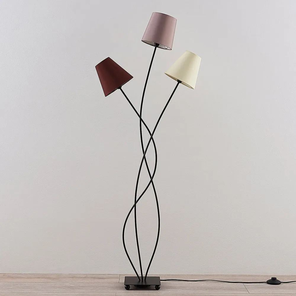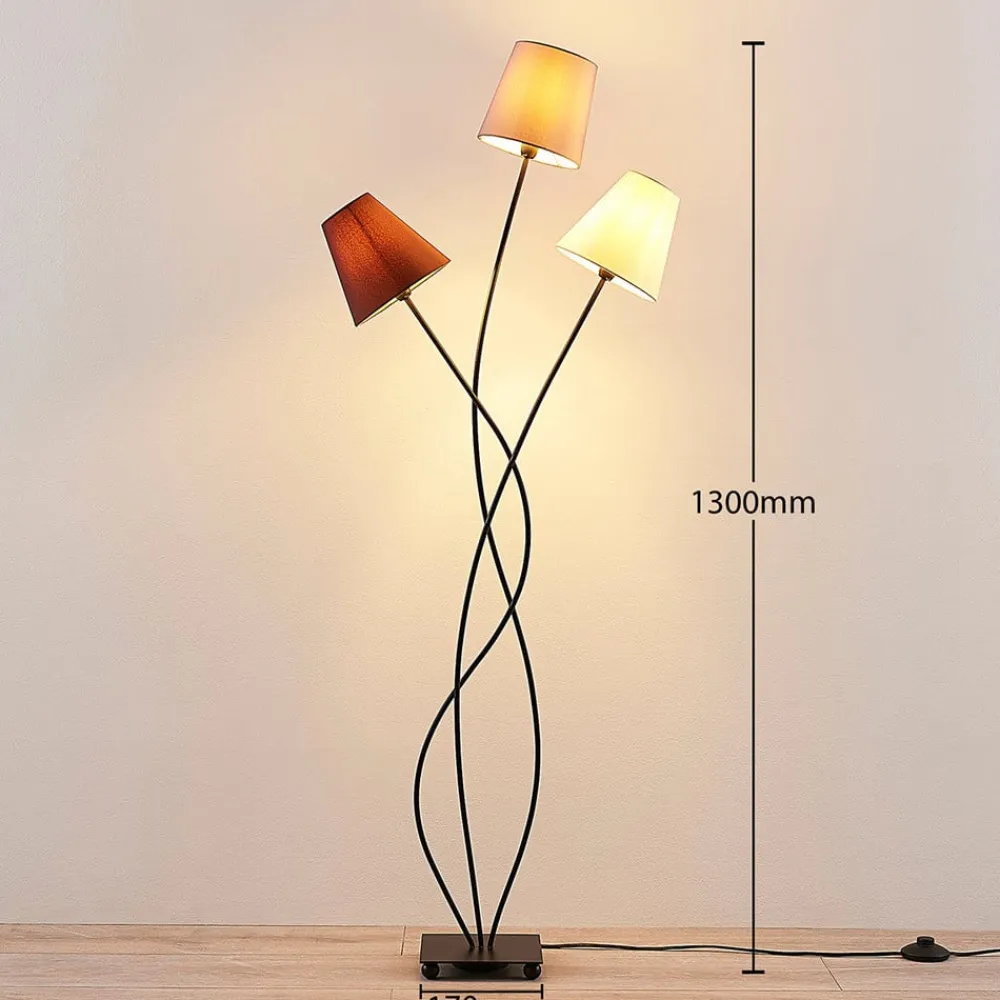 Sammenflettet Melis gulvlampe med skærme i brun, grå og creme Melis er en gulvlampe med et meget legende udseende. Det skyldes især de buede stivere, som er flettet ind i hinanden, og som hver især fører til en lampeskærm. Stofskærmene bliver smallere mod toppen og fås i brun, grå og creme. Det skaber et varmt og blødt lysskær, som spreder en vidunderlig hyggelig atmosfære. Lampestellet er sortmalet og egner sig lige godt som accentbelysning i en stue eller et soveværelse.