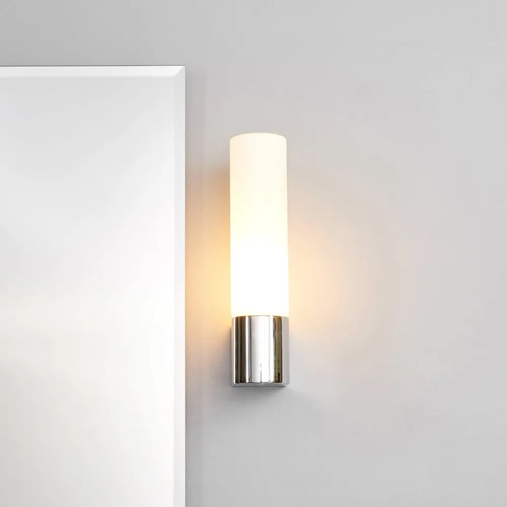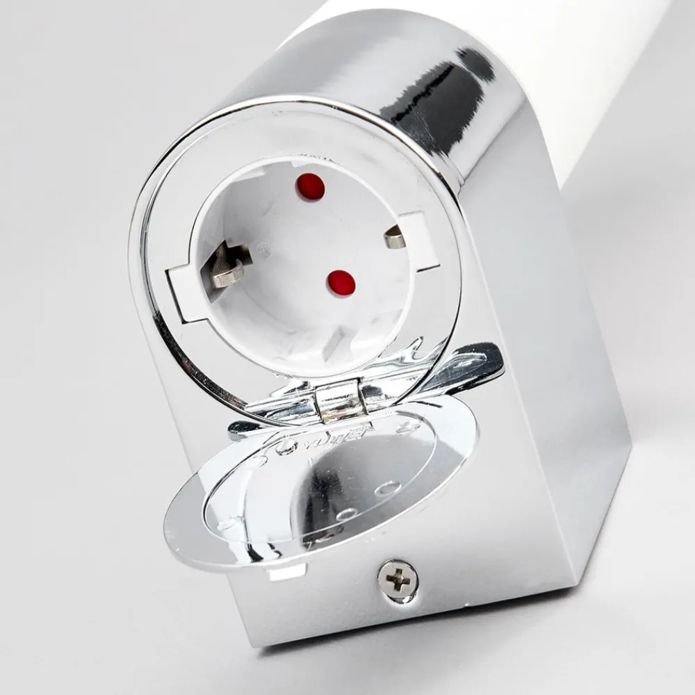 Med stikkontakt – Melike spejllampe Især små badeværelser er taknemmelige for enhver pladsbesparende løsning. Man står ofte over for det problem, at der ikke er nok tilslutninger til stikkontakter og belysning. Melike væglampen slår to fluer med et smæk og er det perfekte valg, når det drejer sig om en lyskilde ved siden af spejlet. Det skyldes, at der er en stikkontakt på undersiden af den blanke, forkromede ramme. Den er godt dækket af en klap, så man ikke kan se den, når den ikke er i brug, og den forringer ikke lampens overordnede udseende. Samtidig er Melike også en stilfuld lyskilde, der imponerer med sit stilfulde design. Selve lyskilden, en traditionel glødepære, er omgivet af en cylindrisk glasskærm, som sikrer en blød lysfordeling. Placeret til højre og venstre for et spejl giver Melike-armaturet et skarpt lys og tilbyder det lille ekstra med sin integrerede fatning.