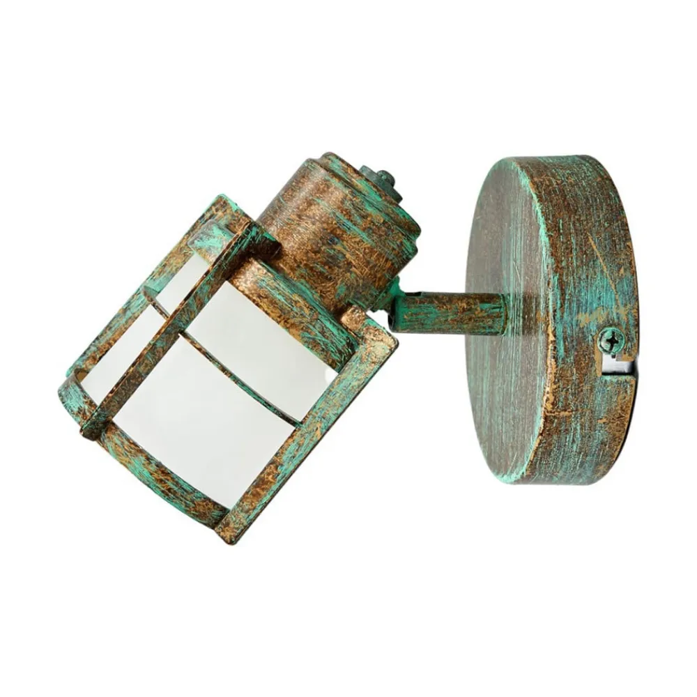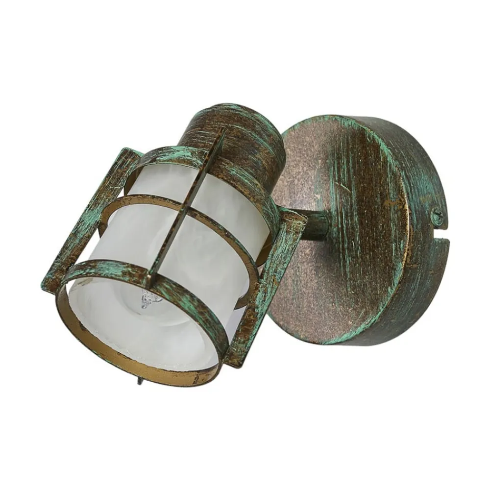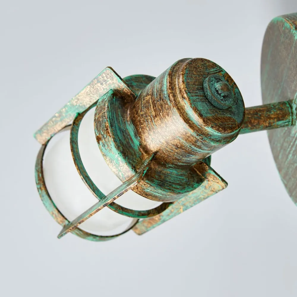 Giorgi kombinerer en hvid glasskærm, med et antikt virkende stel. Derudover finder man et gitterformet metalelement rundt om glasskærmen. Alle metaldele er holdt i et vintage look, idet de er udstyret med en finish i spanskgrønt, der giver indtryk af, at lampen er flere år gammel. Dermed er man garanteret, at lampen passer fremragende til en antik boligindretning.