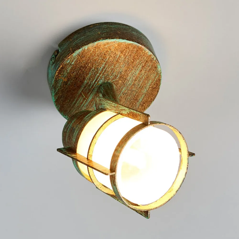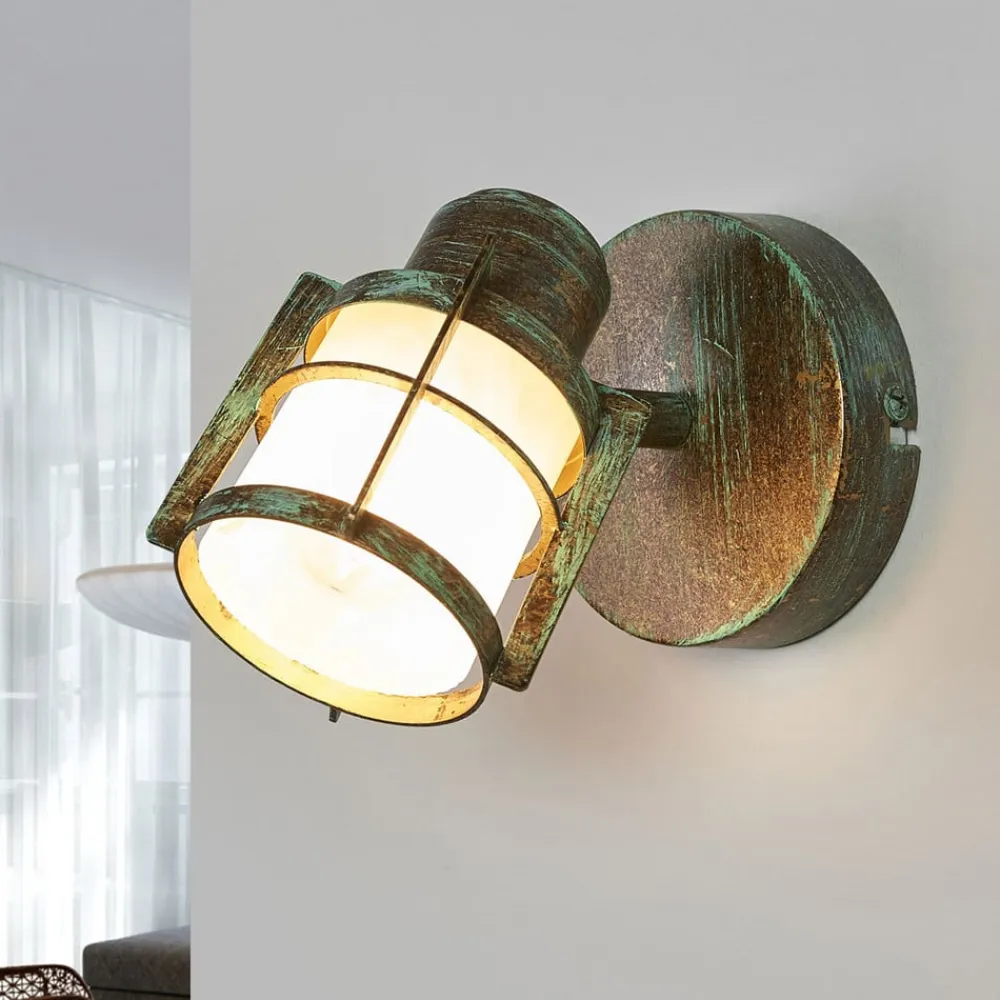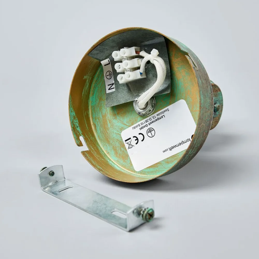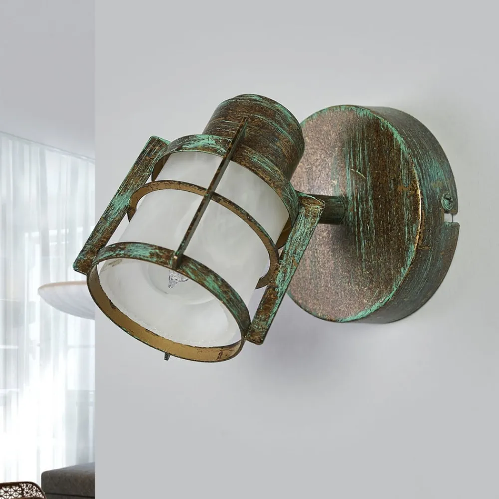 Giorgi kombinerer en hvid glasskærm, med et antikt virkende stel. Derudover finder man et gitterformet metalelement rundt om glasskærmen. Alle metaldele er holdt i et vintage look, idet de er udstyret med en finish i spanskgrønt, der giver indtryk af, at lampen er flere år gammel. Dermed er man garanteret, at lampen passer fremragende til en antik boligindretning.