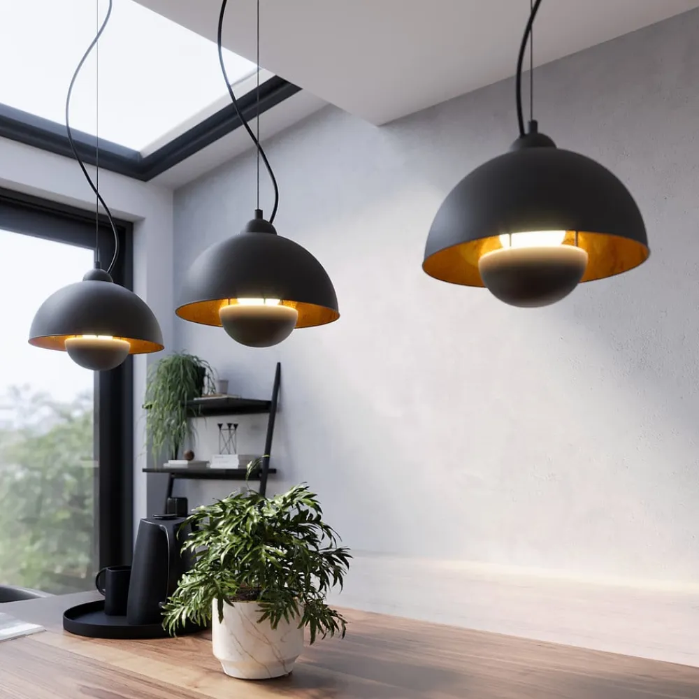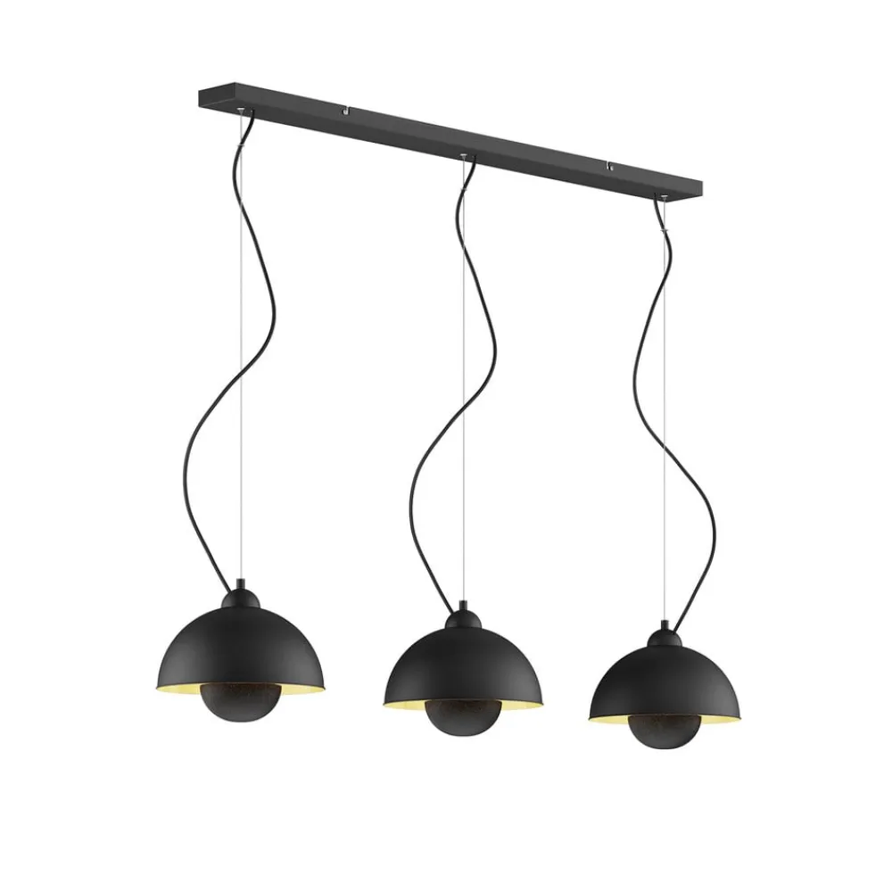 Gretja er et meget stilfuld belysningselement med tre skærme i en flot kuppelform. De udvendige elementer er sorte, mens den skærmen indeni skinner med en gylden foliefinish og ikke kun formidler et varmt udtryk, men også gør lyseffekten meget behagelig, fordi lysskæret så udstråles rigtig hyggeligt. Desuden sidder der over hver E27-pære endnu en mindre kuppel, så man ikke blændes af et direkte lysskær, og kun indirekte lys trænger ud. Rigtig hyggeligt til spisebordet eller en skænk i stuen!