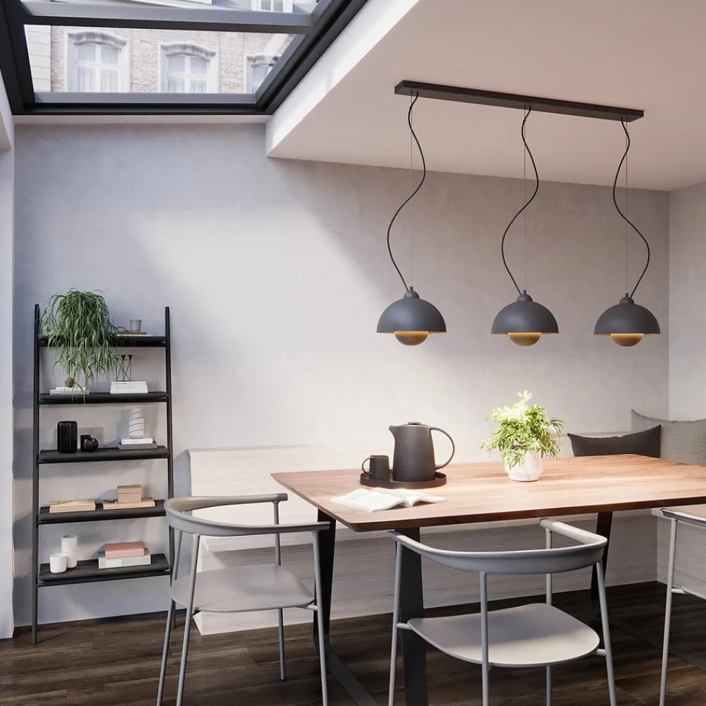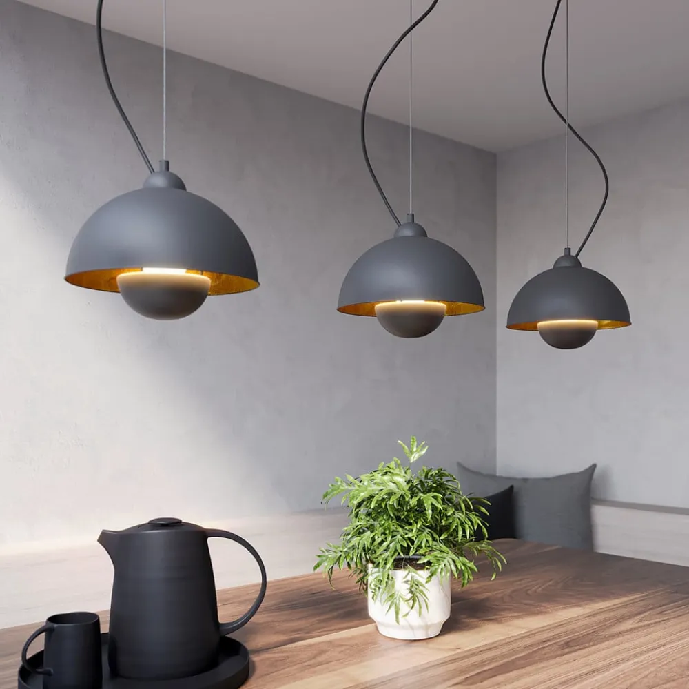 Gretja hængelampe til spisestuen med tre metalskærme i sort-guld