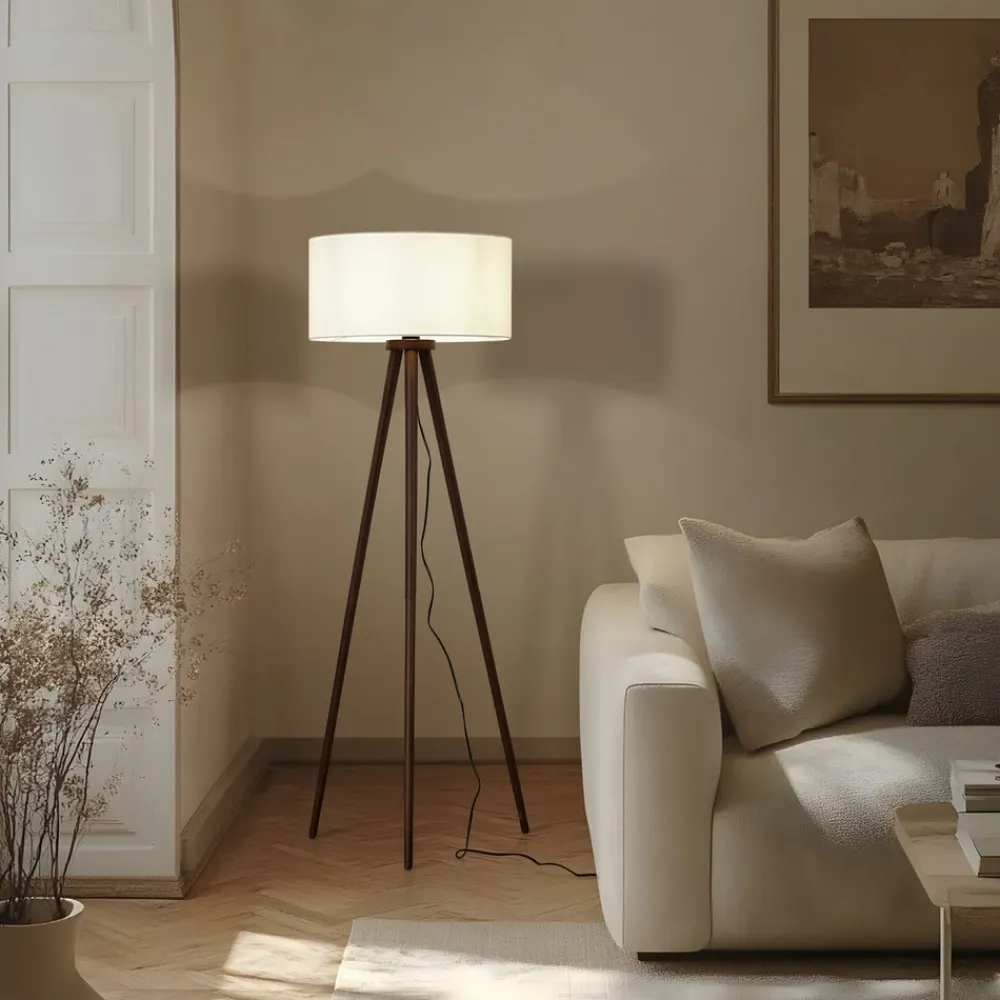 Gulvlampen Charlia forener skandinavisk elegance med varmen fra valnøddetræ og tekstil. Denne kombination af naturlige materialer og klare linjer skaber en harmonisk atmosfære, der passer perfekt ind i stuen, soveværelset eller spisestuen. De mørke træfarver og den hvide lampeskærm skaber et afbalanceret lysspil, der både kan virke beroligende og stimulerende.