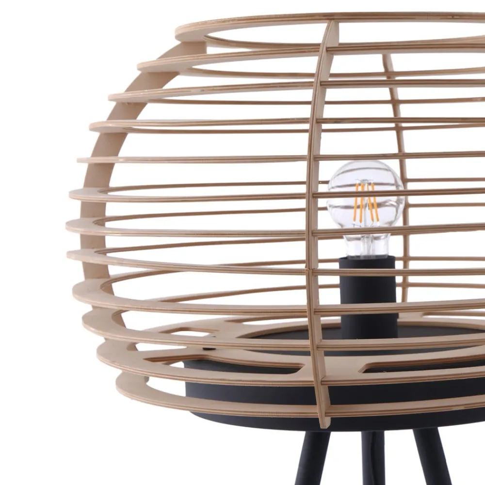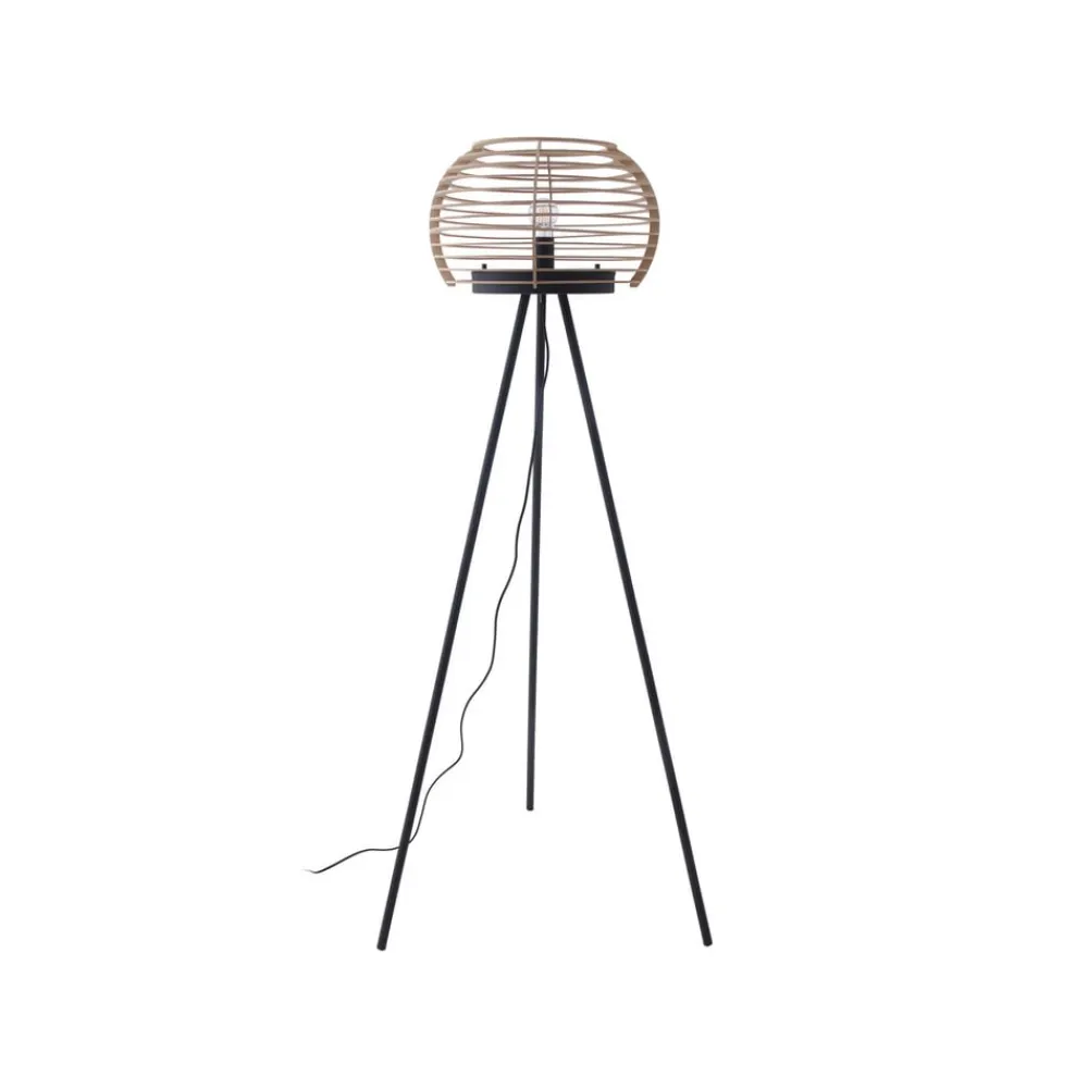 Ediz gulvlampe med stativ og rund træskærm Ediz gulvlampen består af et jernstel og en rund træskærm og er et særligt blikfang til opholdsrummet. Uanset om det er i spisestuen, gangen eller stuen – træskærmen og jernstellet giver gulvlampen et naturligt og alligevel moderne touch til omgivelserne. Den åbne skærm skaber smukke lyseffekter i rummet, og en dekorativ lyskilde er særligt velegnet til belysning. Ediz tændes og slukkes ved hjælp af en fodkontakt, der er integreret i kablet.