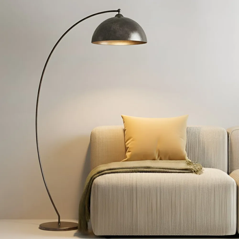 Attraktiv Jonera buelampe i mørkegråt stål – ideel til stuen Denne buelampe er en meget stilfuld lyskilde med en attraktiv kuppelskærm til dem, der ønsker at belyse og sætte scenen i stuen på en smuk måde. Skærmen er lavet af stål, som i sig selv er uigennemsigtigt, så lyset kun slipper nedad og skaber et behageligt lys, der har en blød og diffus effekt i store dele af rummet, men som også kan bruges specifikt til læsning. Overfladen på skærmen og stålstellet er mørkegrå, og som med alle buelamper kan foden placeres excentrisk ved siden af sofaen, selv om skærmen rager længere ud i rummet. Jonera kan betjenes hurtigt og nemt via en fodkontakt i forsyningskablet.