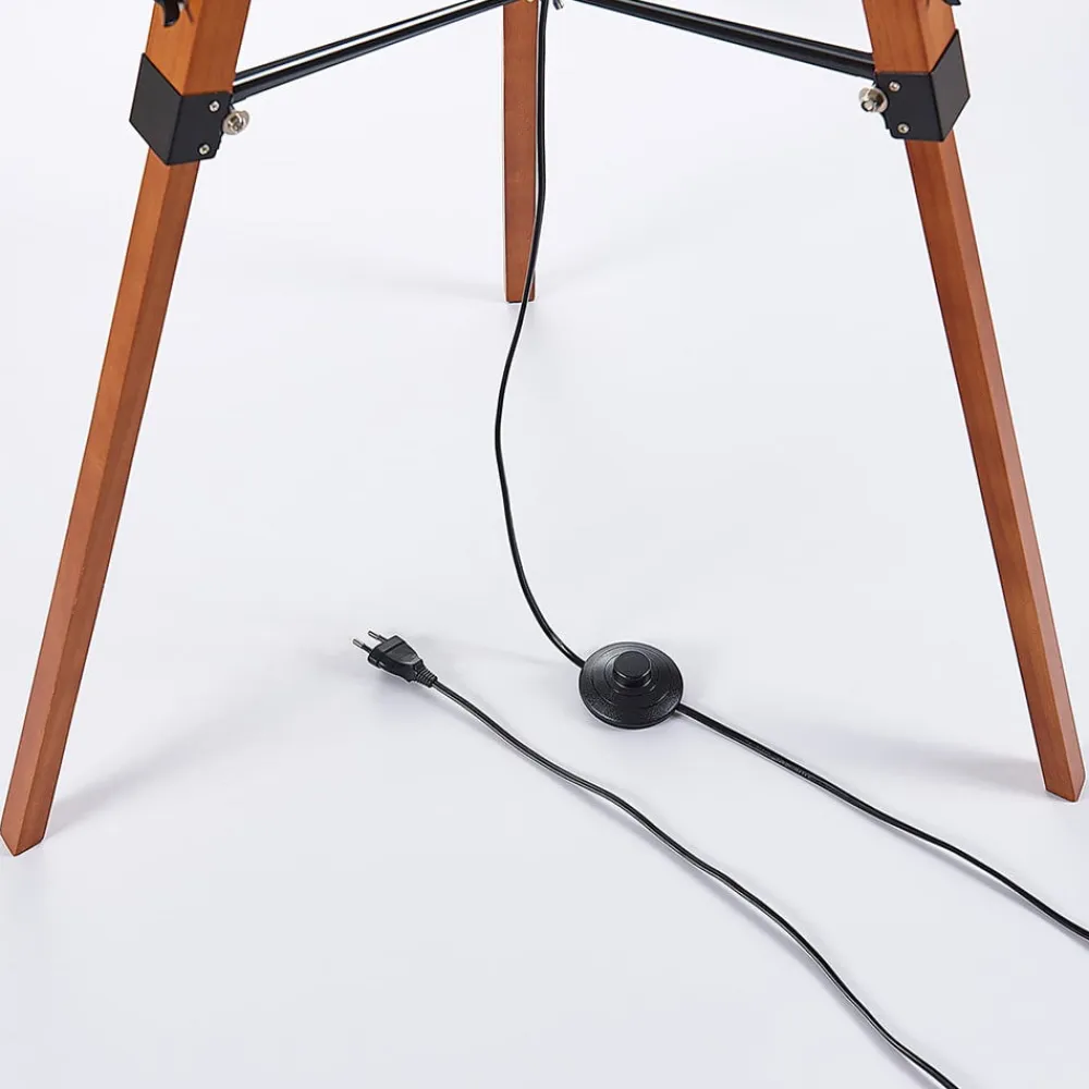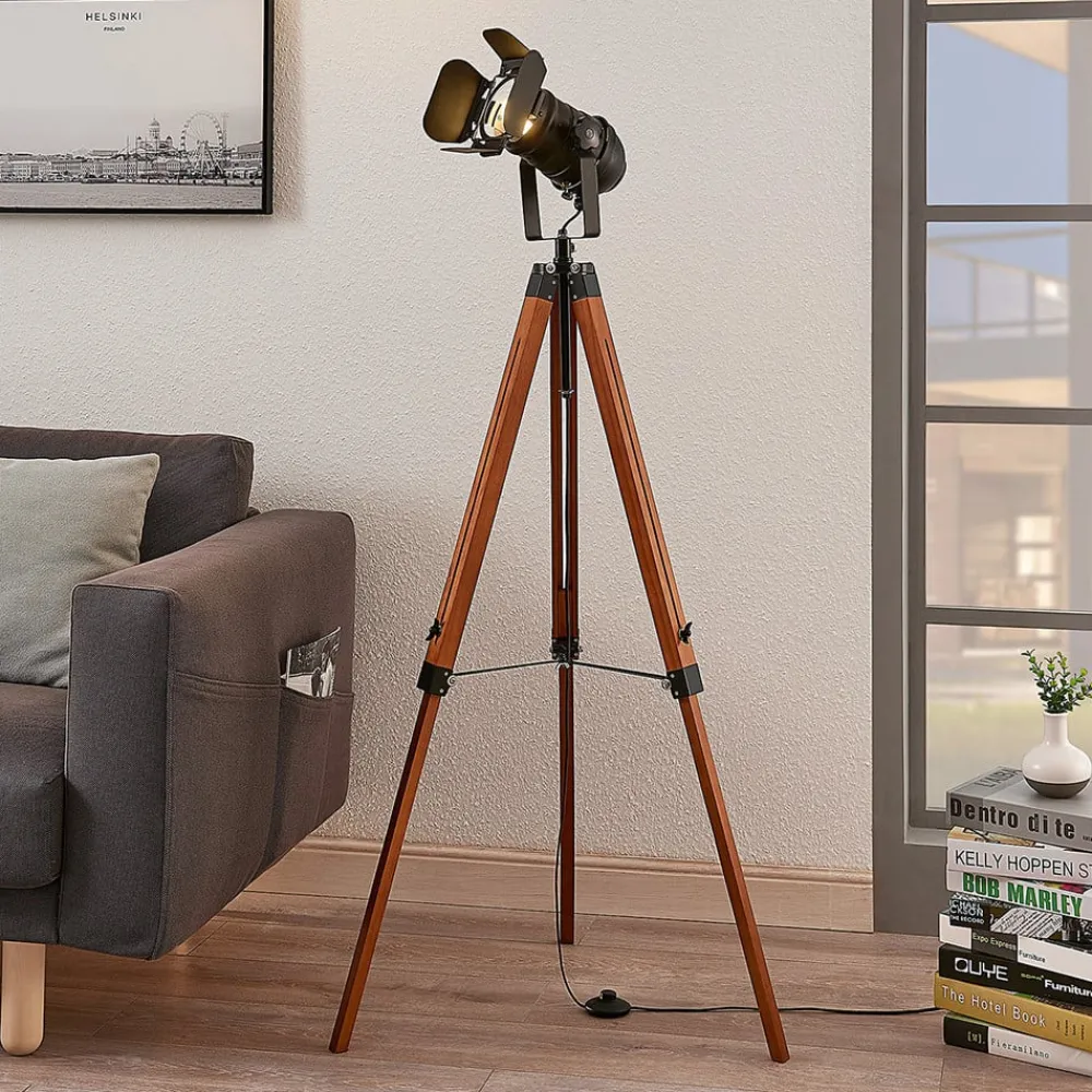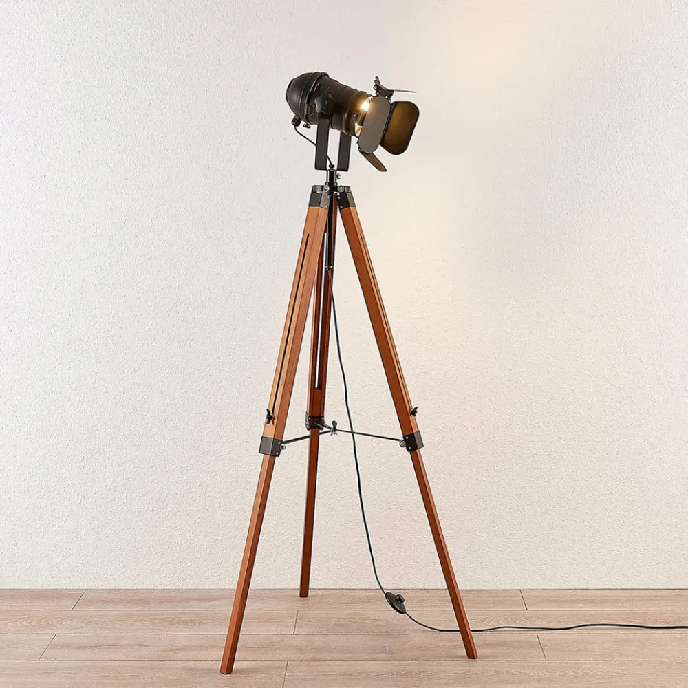 Trefodsgulvlampe Hilma med træstel og skærm med projektørlook