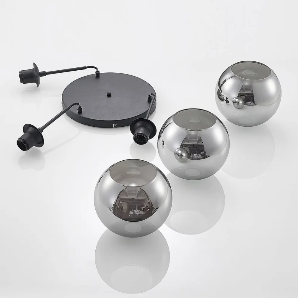 3 lyskilder Jurian hængelampe med røgfarvede glasskærme og detaljer i sort Jurian hængelampen er en smuk lyskilde til stuen, som kan monteres smukt over en spisestue eller et sofabord og har sfæriske glasskærme, der er tonet røgfarvet grå og suppleres af elementer i messing. Lysmønstret er varmt og indbydende, og pærerne indeni er tydeligt synlige, så lamperne skal se dekorative ud og passe godt ind visuelt. Skærmene hænger ned i forskellige højder for at give et blødt udtryk, og designet kan også kombineres godt med vintagemøbler.