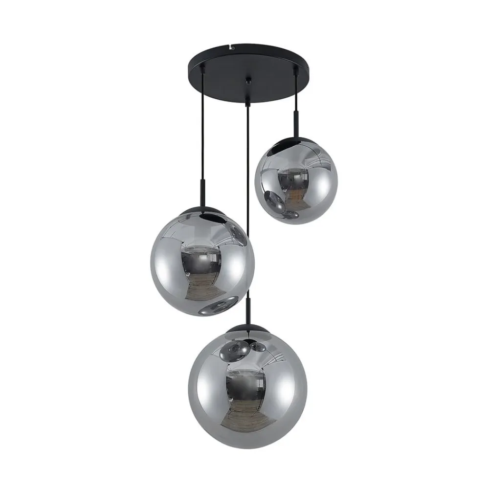 Teeja pendellampe med 3 lyskilder og glaskugler i røget grå Teeja passer godt til moderne indretning, men har også en vis vintagecharme med sine røget grå kugler. De er lavet af klart glas og er derfor relativt gennemsigtige, hvilket kan ses, både når lyset er tændt og slukket. Derfor bør man bruge dekorative lamper, som stilfuldt understreger hængelampens samlede udtryk, f.eks. filamentpærer eller rustikke lyspærer, som er designet i stil med gamle glødepærer, men som regel har effektiv LED-teknologi. Pendellampen er en elegant lyskilde til opholdsrummet og kan f.eks. bruges ved spise- eller sofabordet. Kuglerne hænger ned fra den sorte loftsplade i forskellige højder, hvilket skaber et særligt dynamisk og individuelt look.