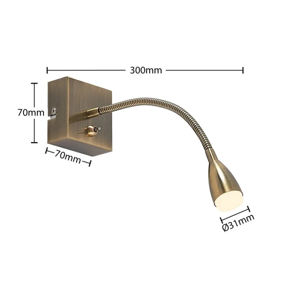 Gammel messingfarvet LED-væglampe Jolka til behageligt lys ved læsning Med LED-læselampen Jolka kan du læse langt ud på de mørke aftentimer. Når det begynder at blive mørkt udenfor, kommer Jolka ind i billedet og oplyser en bog eller et magasin med stor nøjagtighed. Væglampen betjenes, dvs. tændes og slukkes, ved hjælp af den lille kontakt på vægbeslaget. De lyse LED’er lyser og oplyser et lille område. Takket være den fleksible lampearm kan lyskeglen justeres variabelt. Det satiniserede dæksel sikrer, at lyset fordeles jævnt, og at det ikke blænder.