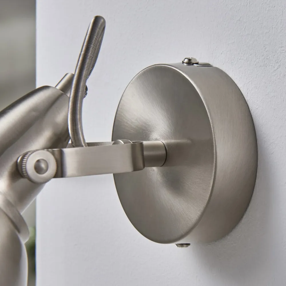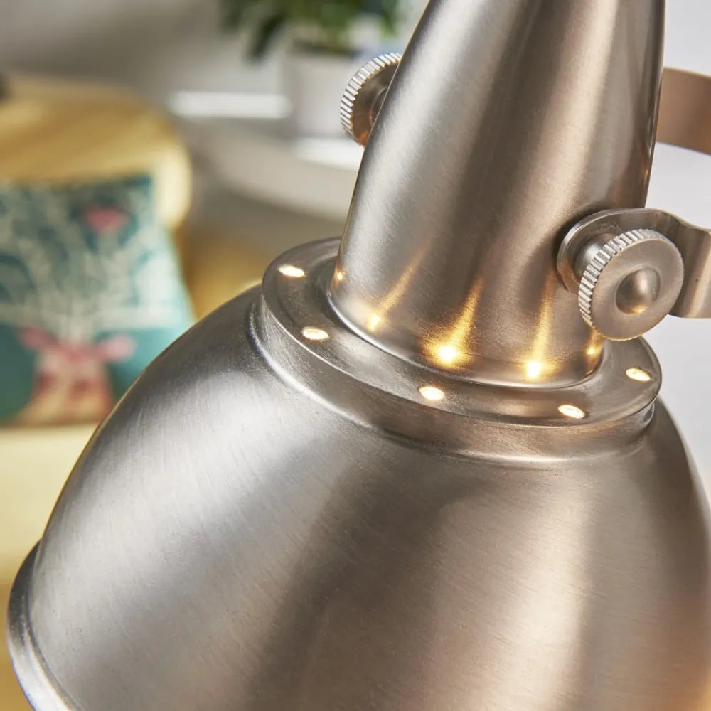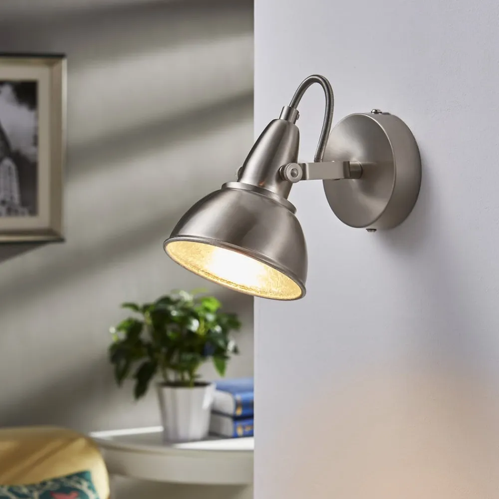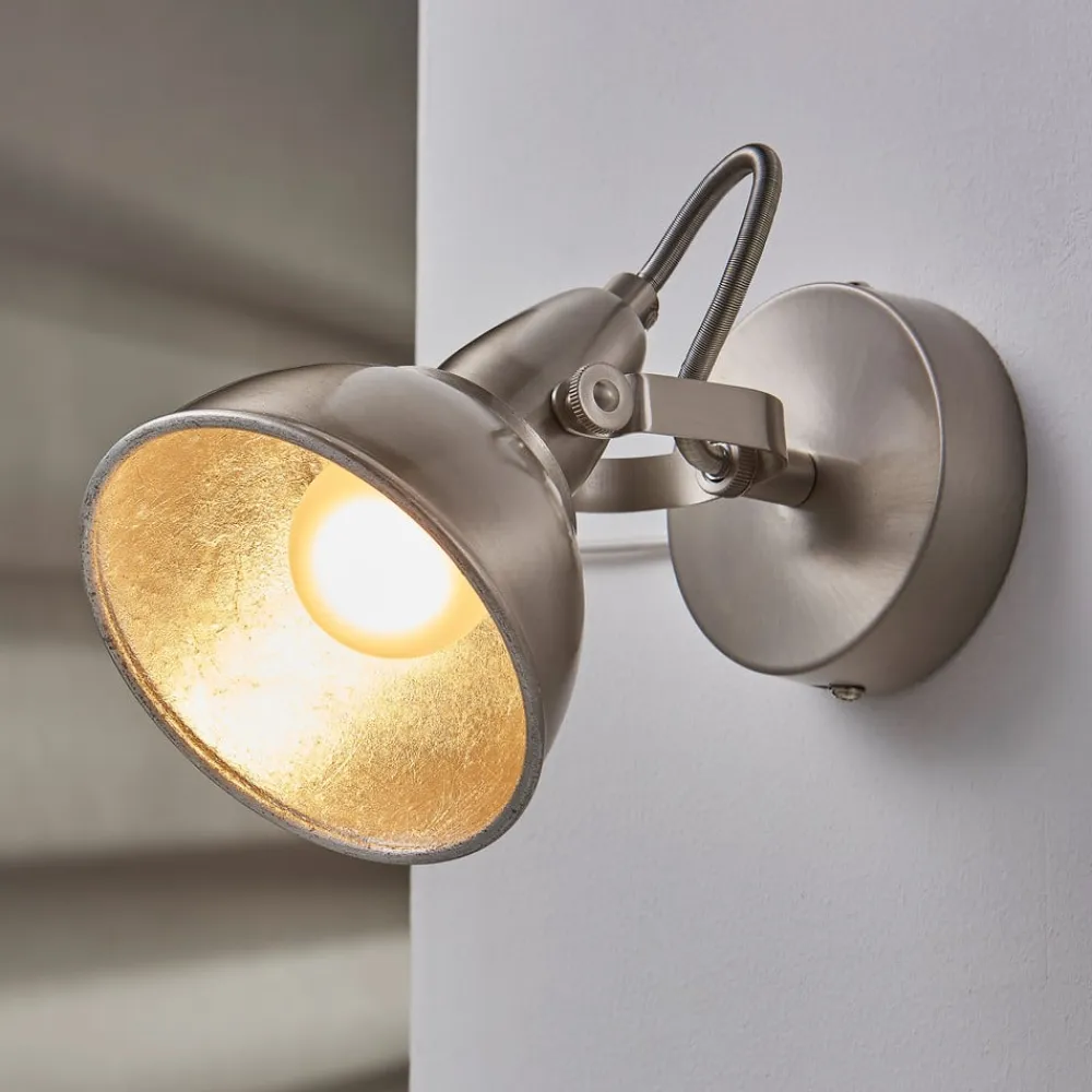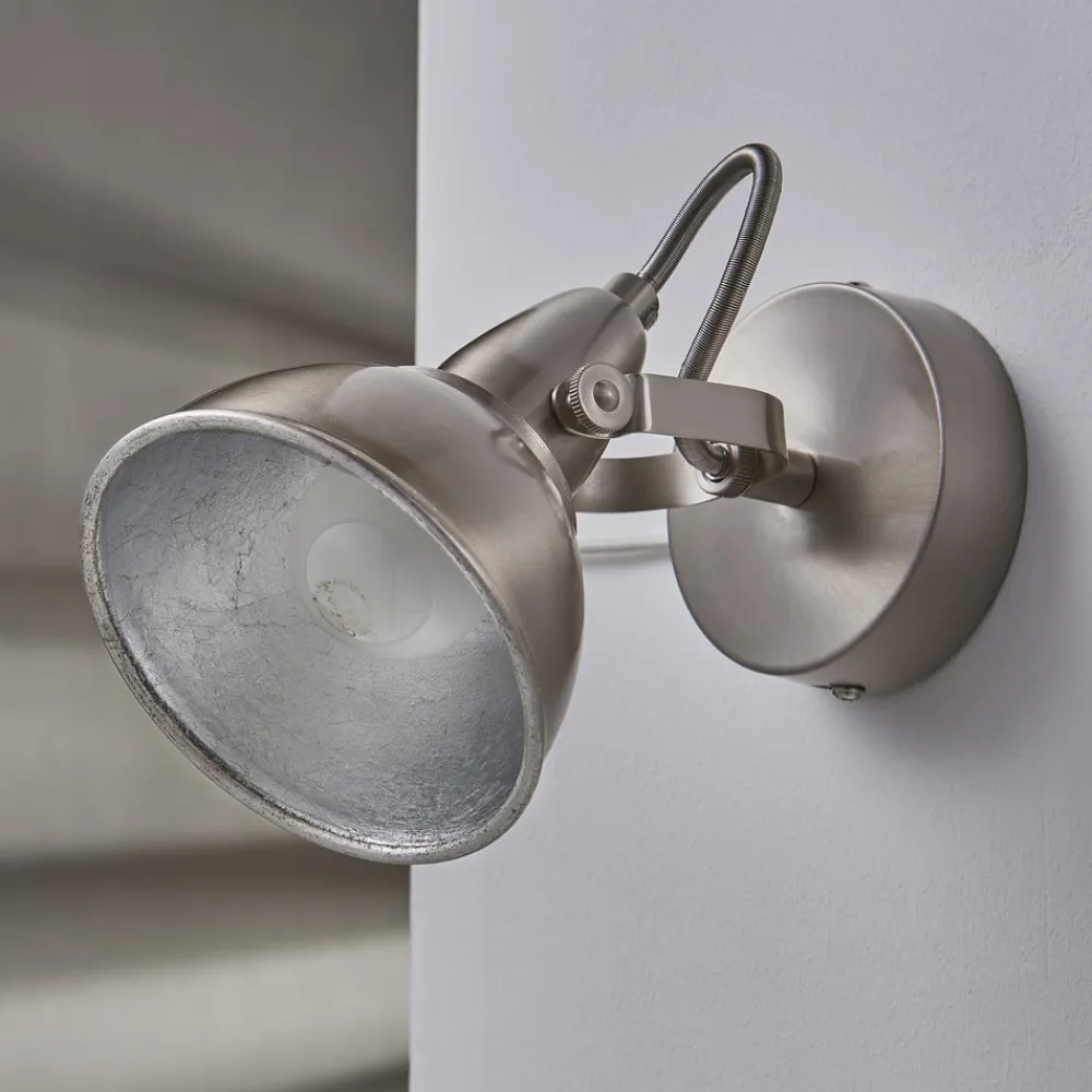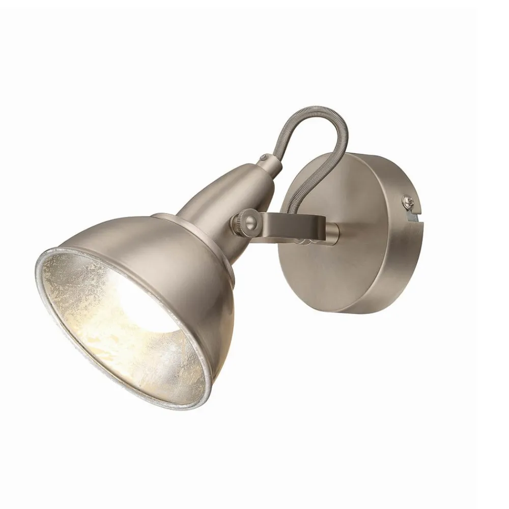 Denne vægspot kan uden tvivl også anvendes som loftbelysning – den er fremstillet af metal med en mat nikkel finish. Ved første blik, kan man ikke rigtig se, at farven på indersiden og ydersiden varierer. Begge farver er faktisk en sølvtone, men overfladen på indersiden er en smule anderledes end på ydersiden. Til dette formål er der brugt sølvpapir, som skaber en refleksion på lampen hvormed man opnår et specielt vintage look, idet overfladen ikke får en ensartet overflade, men nærmere virker som om den er ved at skalle af. Således foranlediges man til at tro, er vægspotten ikke er helt ny, men er fra en anden tid. Lampehovedet kan justeres, så lyset bedre kan tilpasses.