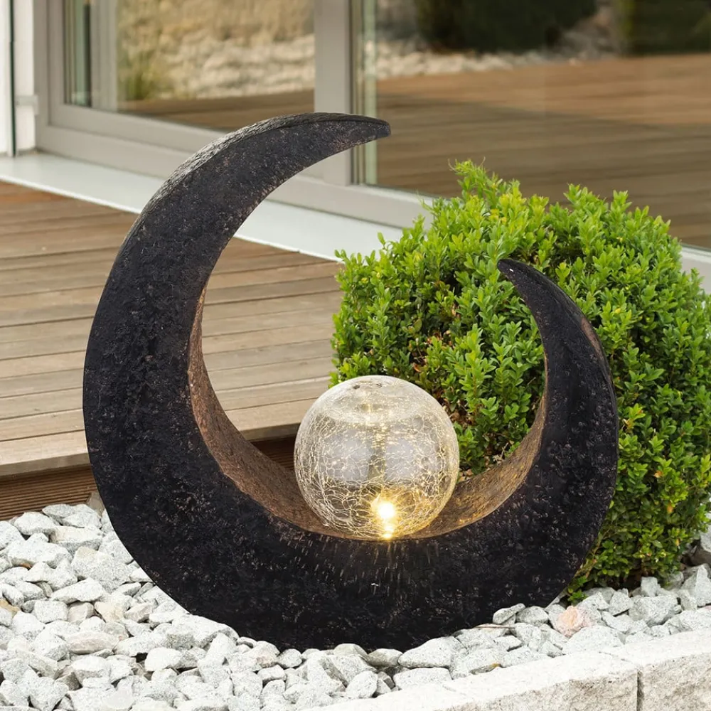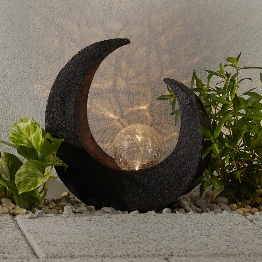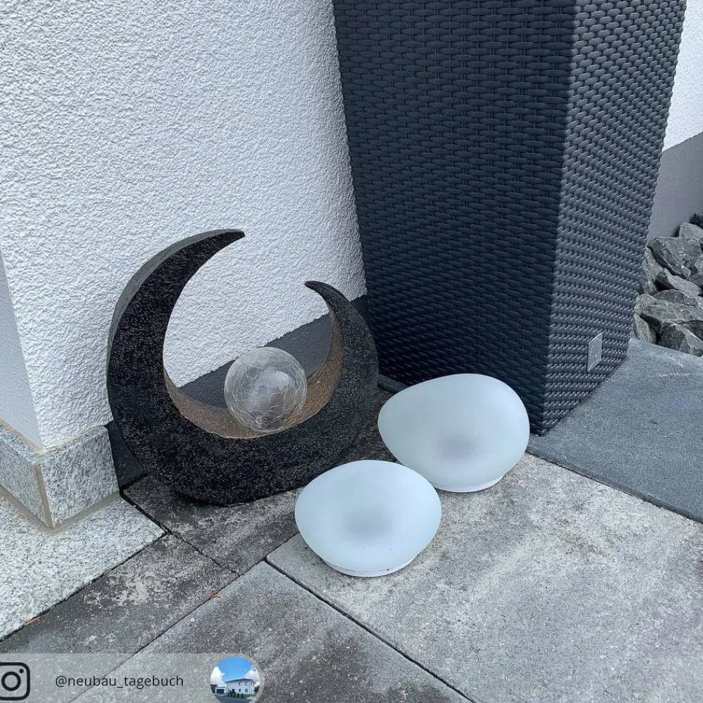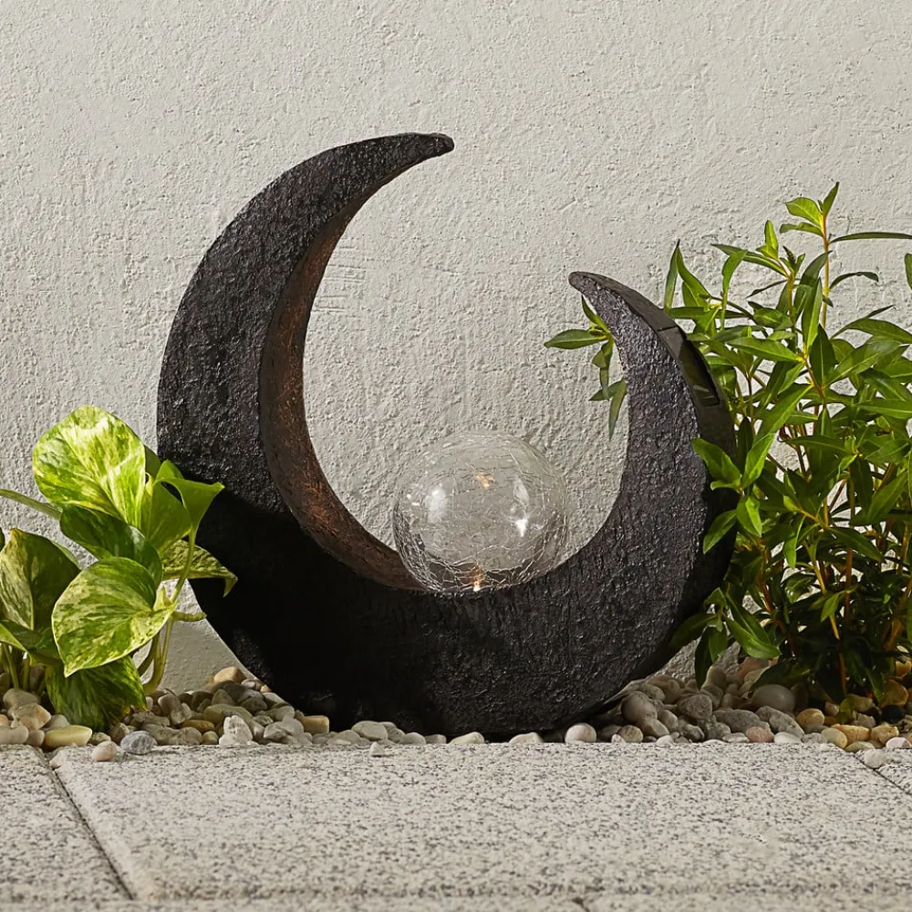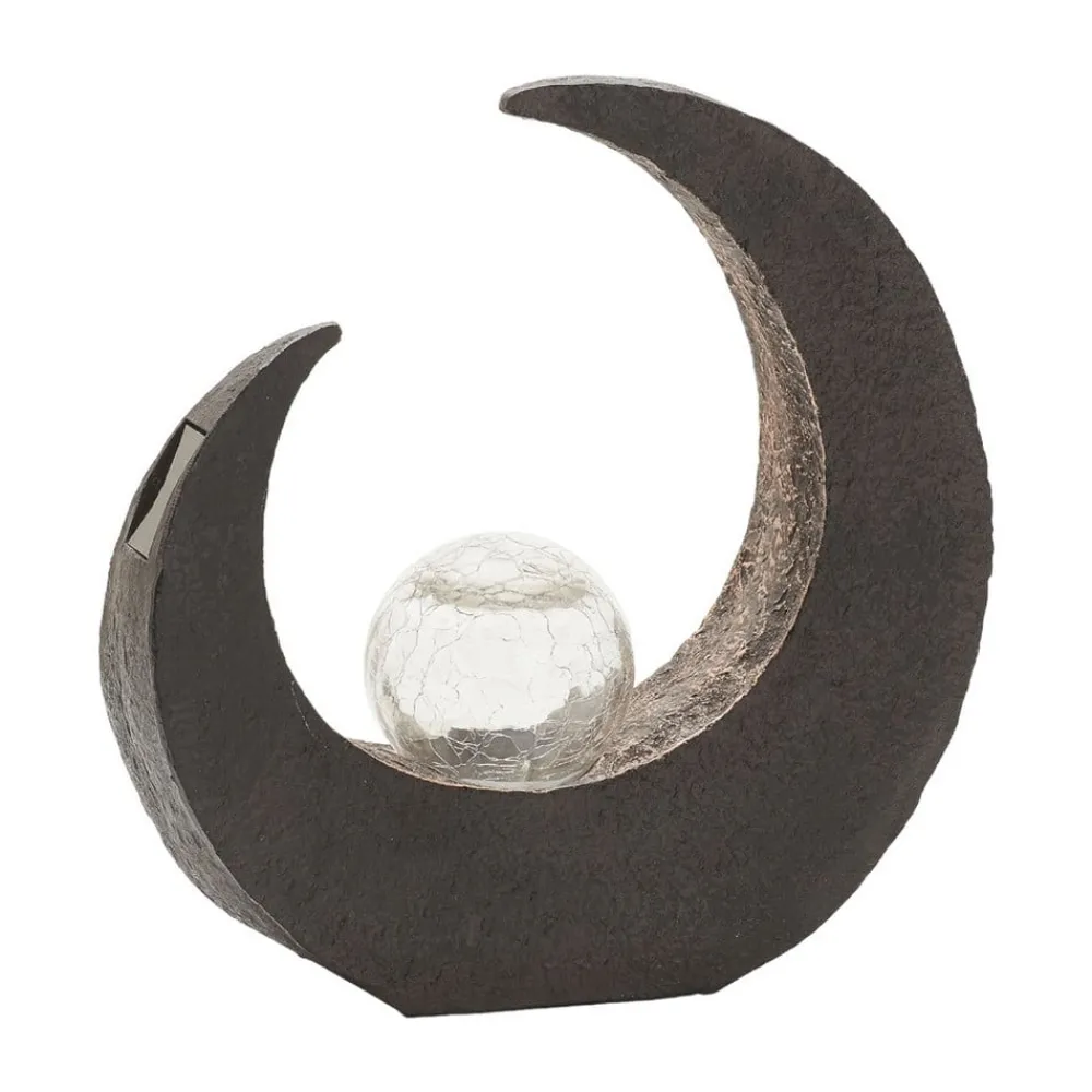 Brun LED-dekorationslampe Adem i månedesign Endelig skinner haven i måneskin hver aften, for LED-dekorationslampen Adem er formet som en halvmåne og giver udendørsområdet et drømmende blikfang. Den brune farve træder i baggrunden og lader lyset fra den runde lampekrop være det eneste fokus. Mens lampekroppen bader haven i sit skær om aftenen og natten, oplader den sig selv i løbet af dagen via et solpanel. Det betyder, at bænken, dammen og andre elementer altid er perfekt oplyst og dekorativt iscenesat.