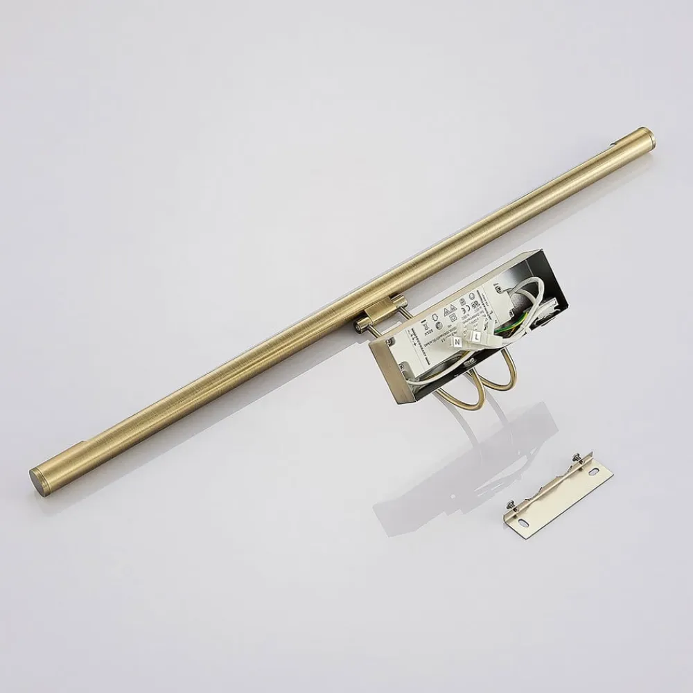 Buet LED-gallerilampe Mailine med nedadrettet lys og en metaloverflade i patineret messing