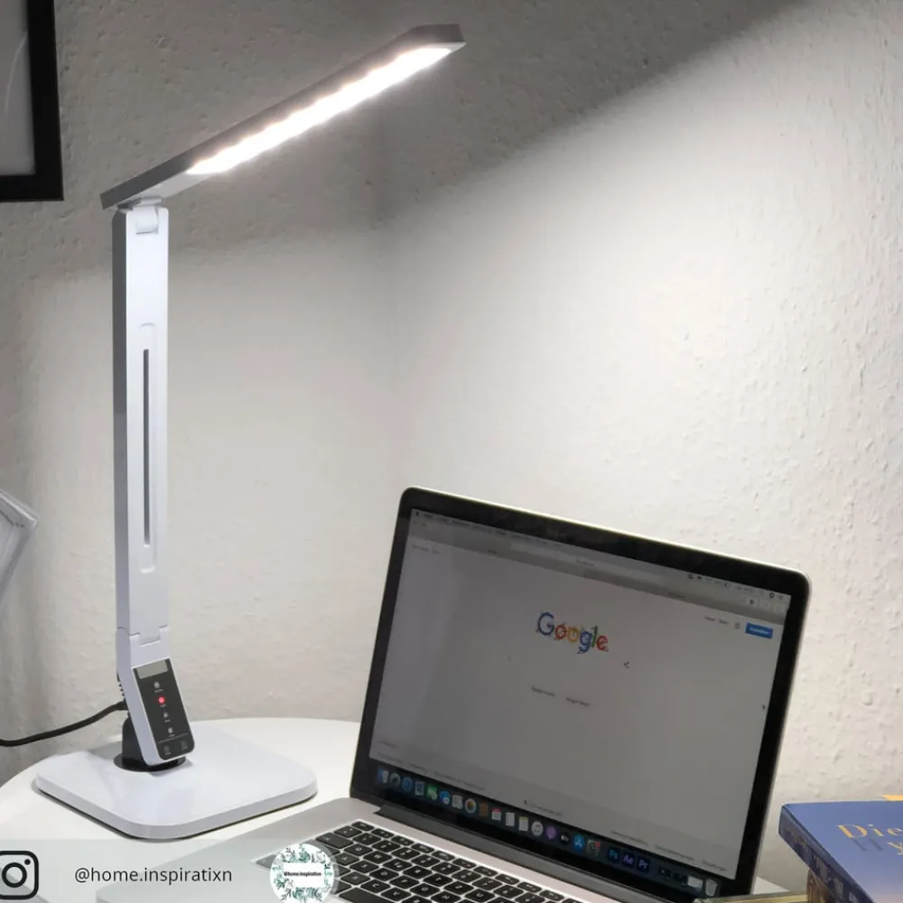 Dæmpbar Eleni LED-skrivebordslampe i moderne design Eleni LED-skrivebordslampen imponerer straks med sine mange fordele og ekstraudstyr. Den har et lineært, moderne design, som ser særligt elegant ud takket være det hvide farveskema. Dens ramme har to led, så lyset altid kan rettes efter personlige præferencer. Der er forskellige berøringskontakter på armaturet, som kan bruges til at regulere Elenis lysfarve. Der er fire forudindstillede tilstande: “Reading” (dagslys, ca. 5.700 K), “Study” (universalhvid, ca. 5.000 K), “Relax” (universalhvid, ca. 4.000 K) og “Sleep” (varmhvid, ca. 2.700 K). Lysstyrken kan også justeres i 5 niveauer ved hjælp af en integreret dæmper (knap med “+/-“-symbol). Takket være denne store fleksibilitet kan Eleni skrivebordslampen bruges som lyskilde til mange forskellige lejligheder, da den til enhver tid kan tilpasse sig individuelle behov. En yderligere funktion er 60-minutters timeren. Hvis den er aktiveret, slukker Eleni-lampen automatisk efter en time.