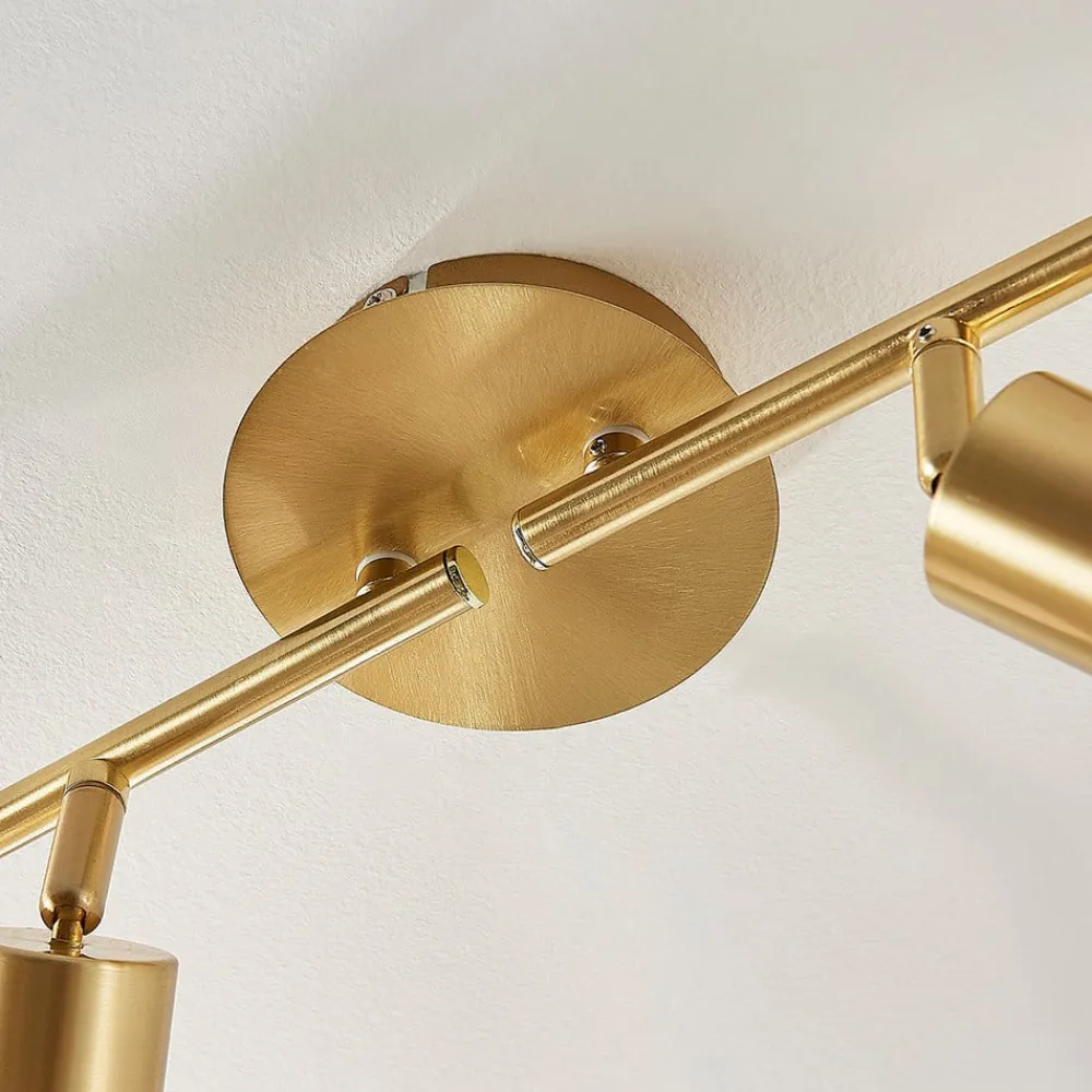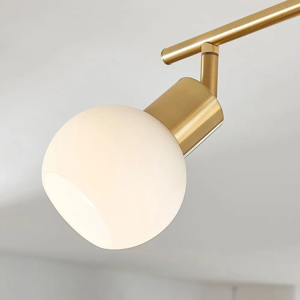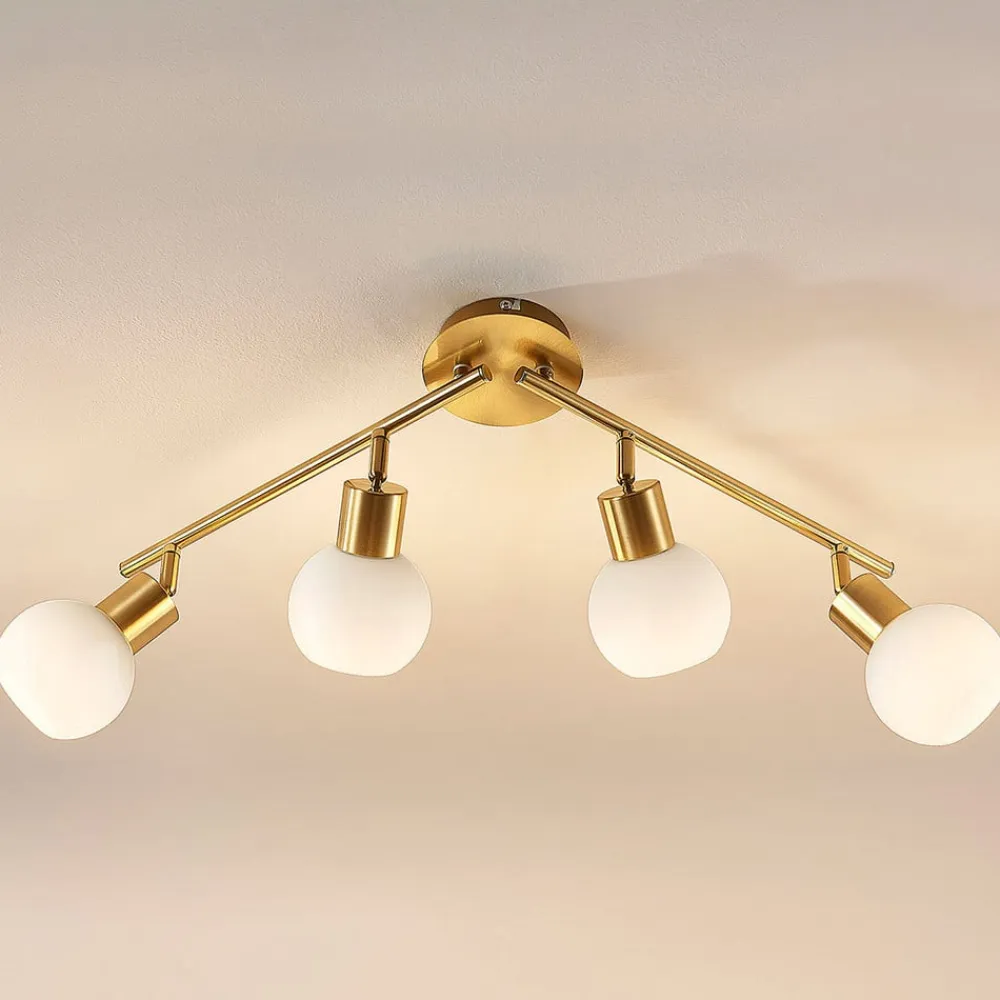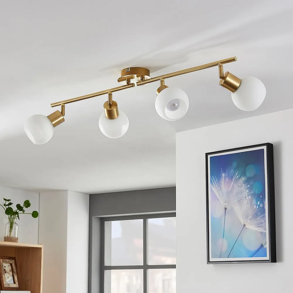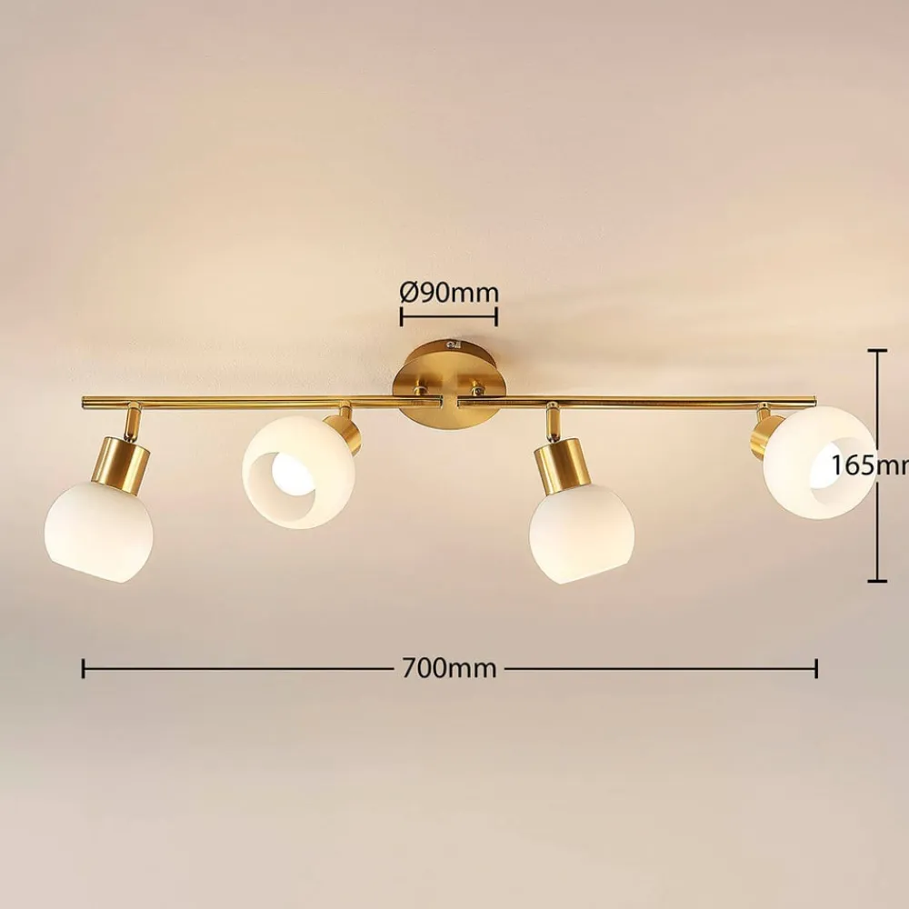 Elaina loftlampe med opale glasskærme De hvide glasskærme på den 4 lyskilder store loftlampe giver et smukt og jævnt lys, og lampehovederne kan justeres efter behov. Det gør Elaina til en velegnet lyskilde til en lang række formål, rum og stilarter. De passende pærer kan vælges frit. Loftlampen kan dæmmes ved hjælp af en ekstern fasedæmper og kompatible lamper.