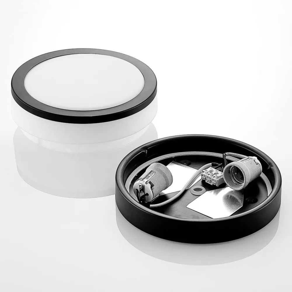 Sort mat loftlampe Flavi i en rund form som smuk badeværelsesbelysning Denne smukke lampe har et klassisk rundt design og en jernramme med en sort mat finish. Dette look er diskret og trendy på samme tid, da udseendet af Flavi loftlampen bringer en moderne lethed til badeværelset. Takket være kapslingsgraden IP44 er den meget modstandsdygtig over for fugt og er derfor ideel belysning til badeværelset. Lyset spredes og udsendes jævnt gennem den opalmatte lampeskærm, så beskueren ikke blændes.
