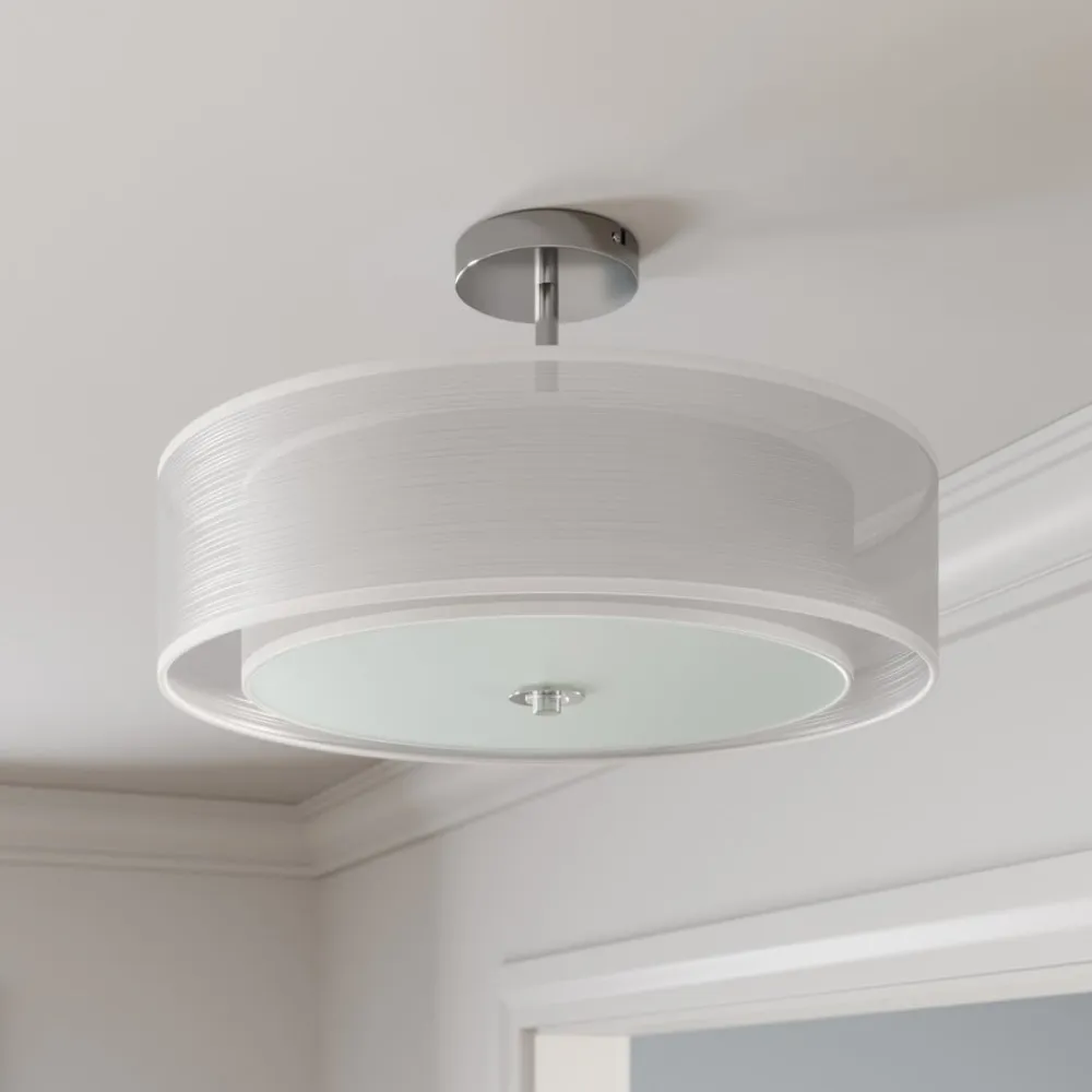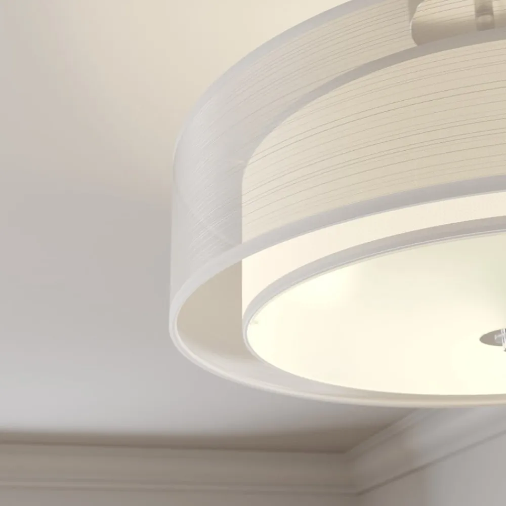 Smuk Pikka loftlampe i stof i hvid Pikka loftlampen i stof drives med E27-lamper. Skærmen på stofloftlampen, som er fastgjort til loftet med lidt afstand, ser så elegant ud, fordi det faktisk er to skærme, der effektivt er blevet kombineret til én. Den ydre skærm er gennemsigtig og lavet af organza-stof, mens den indre skærm er lavet af et fastere stof. På undersiden af den inderste skærm er der desuden monteret en plade af hvidt glas, så lyset dæmpes blidt og får en særlig hyggelig effekt.
