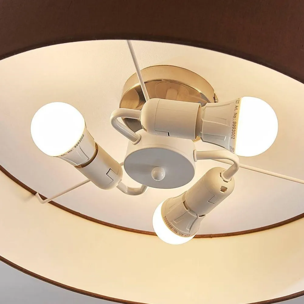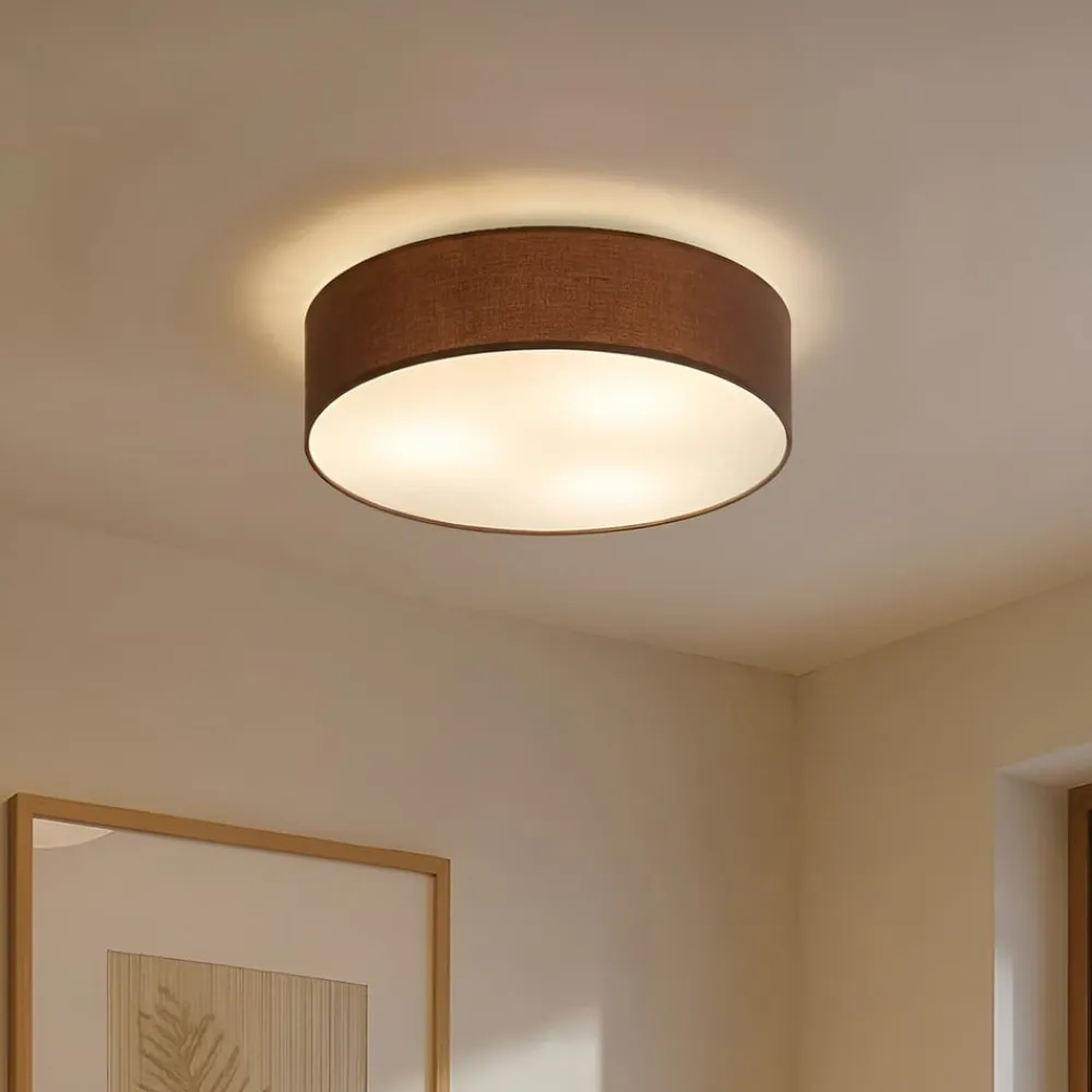Sebatin loftlampe i brun til E27-lamper Brun er en smuk farve, som bliver mere og mere populær, og som falder i god jord, når det gælder indretning af boligarealer. Lyset fra Sebatin loftlampen er varmt og hyggeligt. Ydersiden af skærmen er lavet af brunt stof, undersiden er også stofbeklædt, men her med en hvid overflade, så der stadig kan slippe tilstrækkeligt med lys ind i boligarealet. Lampen kan monteres med E27-pærer.