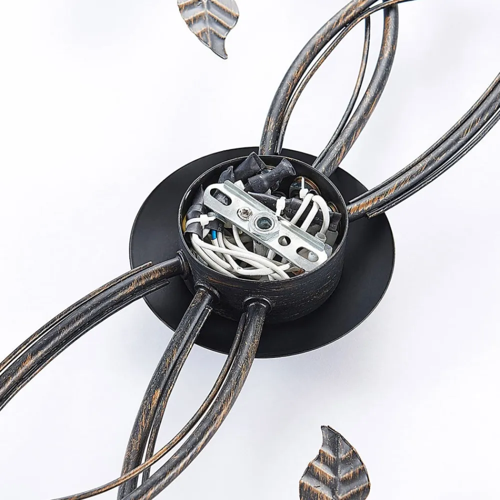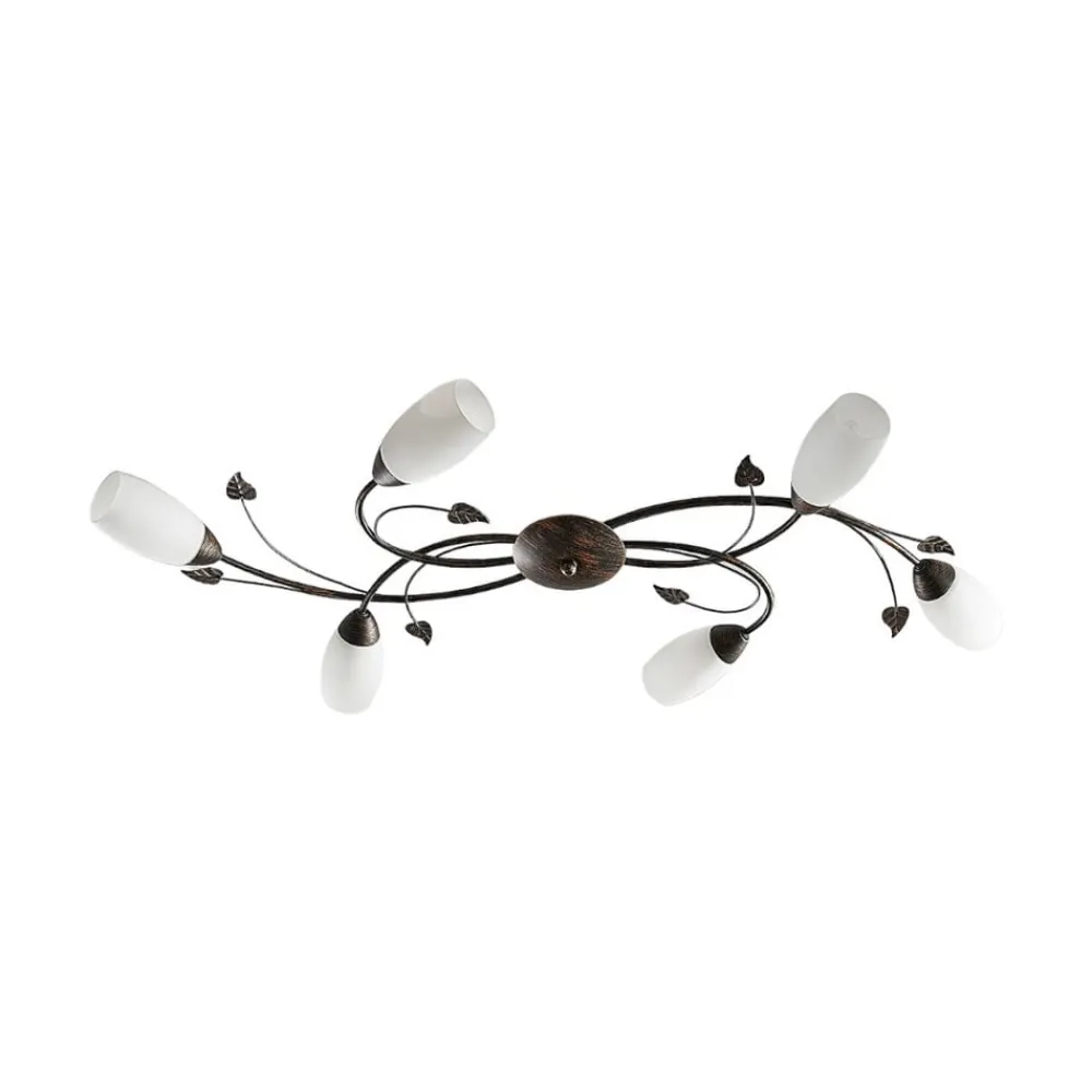 6 lyskilder Stefania loftlampe med romantisk look Stefania er en loftlampe, der har et umiskendeligt romantisk look og giver et smukt, jævnt lys takket være det hvide glas. Lampearmene er romantisk buede og suppleres af bladformede metaldekorationer. Desuden er den sorte overflade på stellet blevet afsluttet med sarte penselstrøg i guld, som passer perfekt ind i det overordnede design.