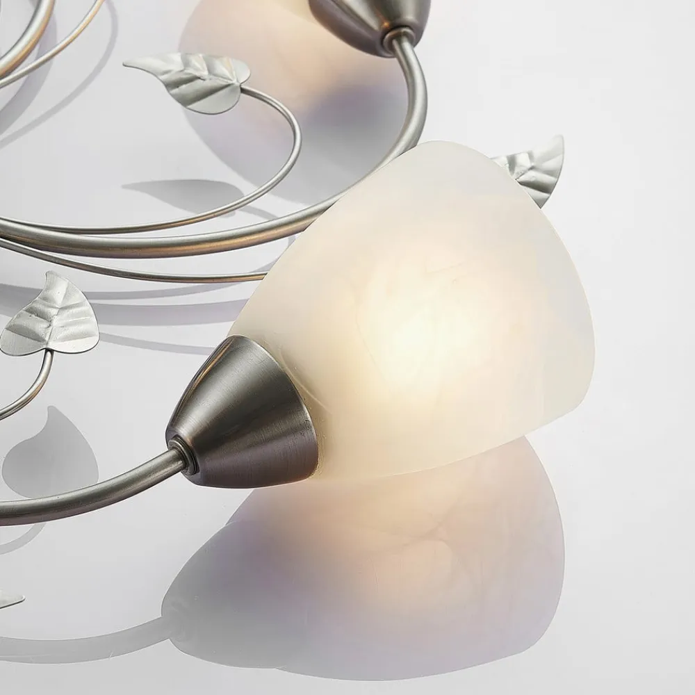 Yannie-loftlampe med 5 lyskilder og buet look Den moderne, elegant legende Yannie-loftlampe har fem lampeskærme af subtilt marmoreret glas. Det buede, let blomstrede look skabes af de buede lampearme, som er dekoreret med små blade. Stativets matte nikkelfinish i blød kontrast til de hvide lampeskærme af glas passer også ind i mange forskellige boligindretninger. Uanset om det er i stuen, gangen eller soveværelset, giver Yannie tilstrækkeligt med lys i alle rum.