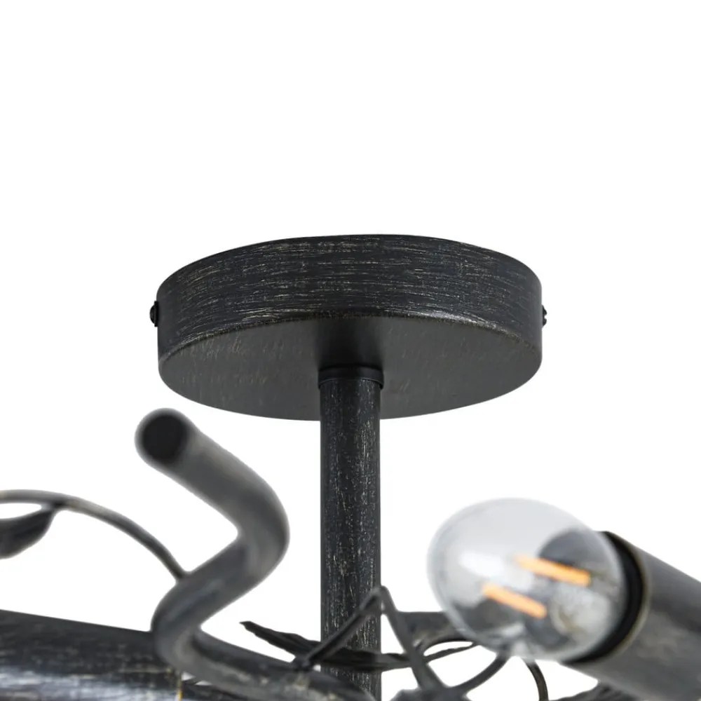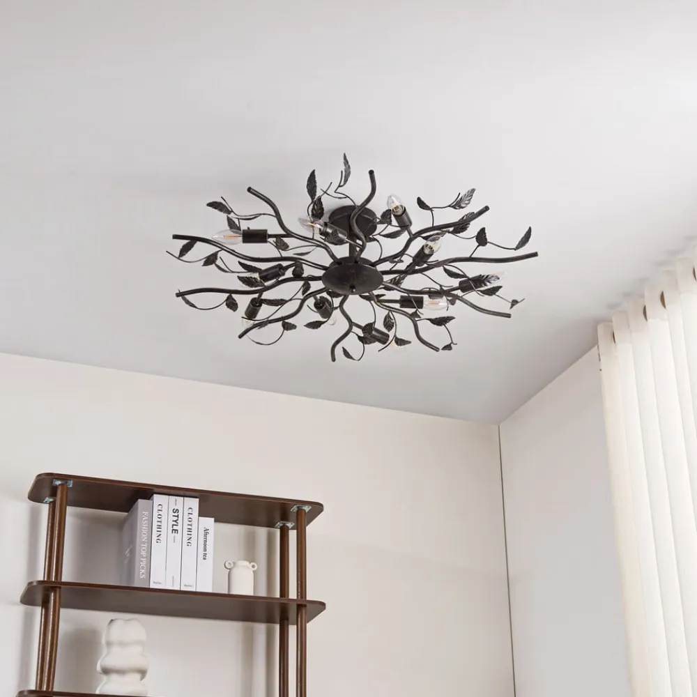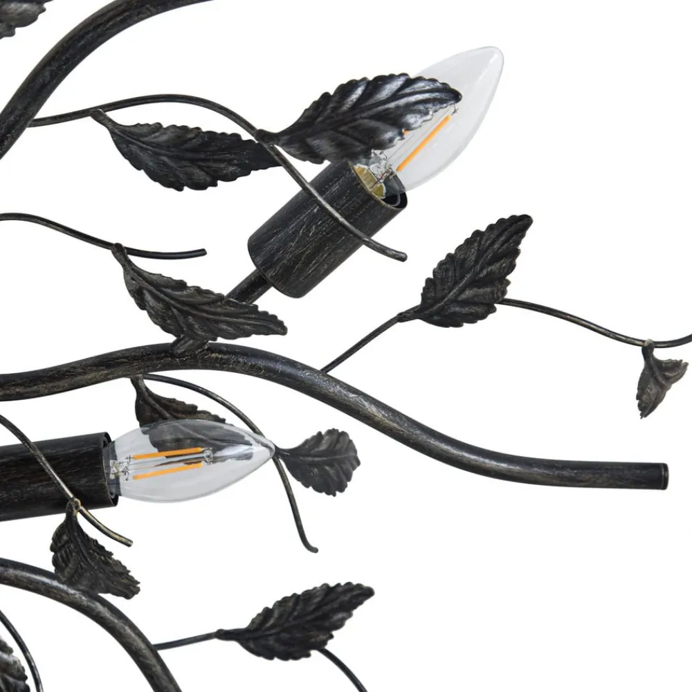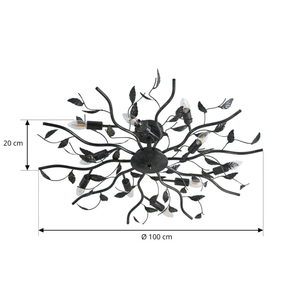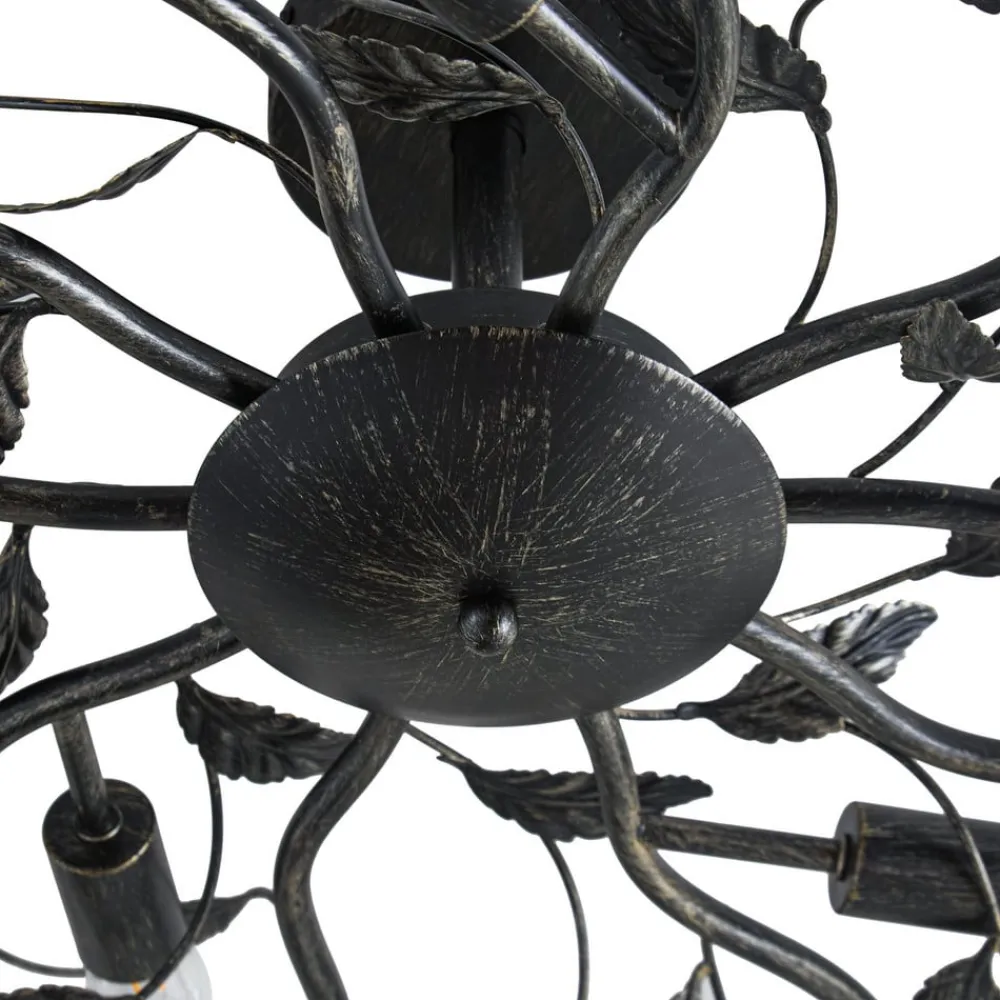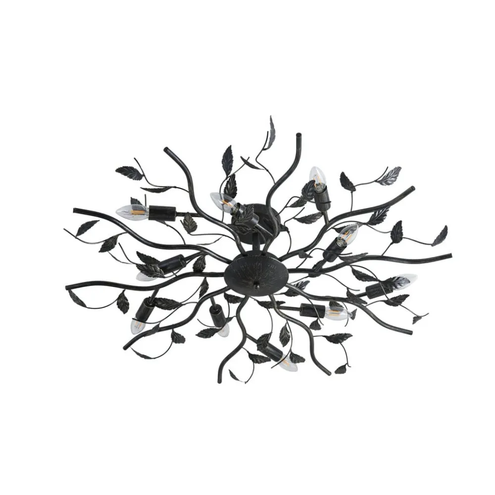 Sort-gylden loftlampe Yos med bladlignende dekor og ti E14-fatninger