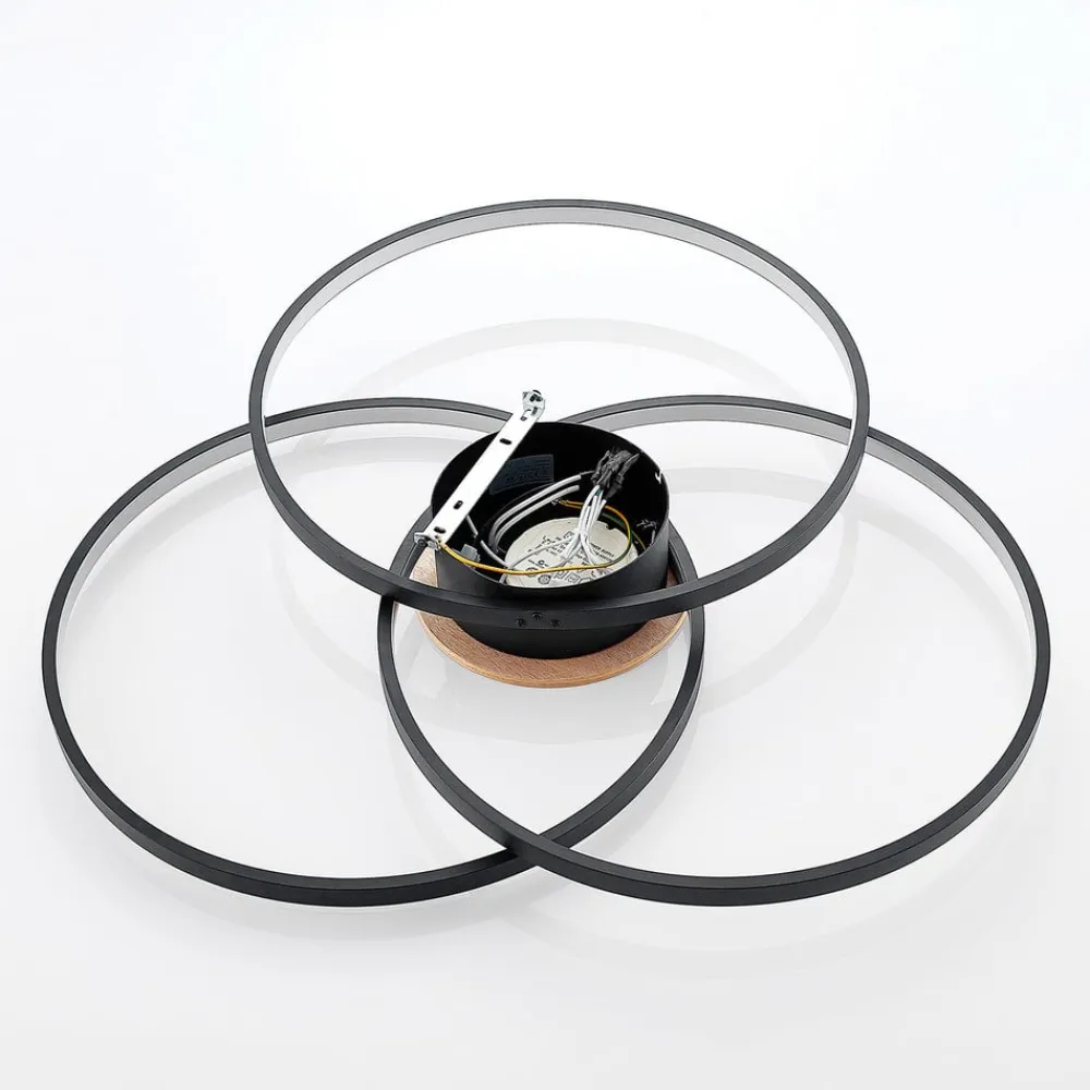 Sort LED-loftlampe Riley med dekor i trælook, dæmpbar via kontakt Riley er en lyskilde til mange moderne indretninger, der også imponerer med sin teknologi, da loftlampen lyser med varmhvide LED’er, der ikke kun er lyse, men også kan justeres i lysstyrke i tre trin ved hjælp af kontakten på væggen. Det symmetriske, overlappende arrangement af de tre ringe skaber et blomsterlignende look med æstetiske krydsninger, og i midten over loftbeslaget er der et rundt dækelement i trælook, som bliver det dominerende element i det samlede look. dæmpbar + off: En vægkontakt gør det muligt at tænde og slukke lyset, som man plejer. Takket være 3-trins-dæmpningsteknologien med integreret slukfunktion kan den også dæmmes til tre forskellige lysstyrkeniveauer ved at trykke på kontakten flere gange: 100 %, 50 % og 25 %.