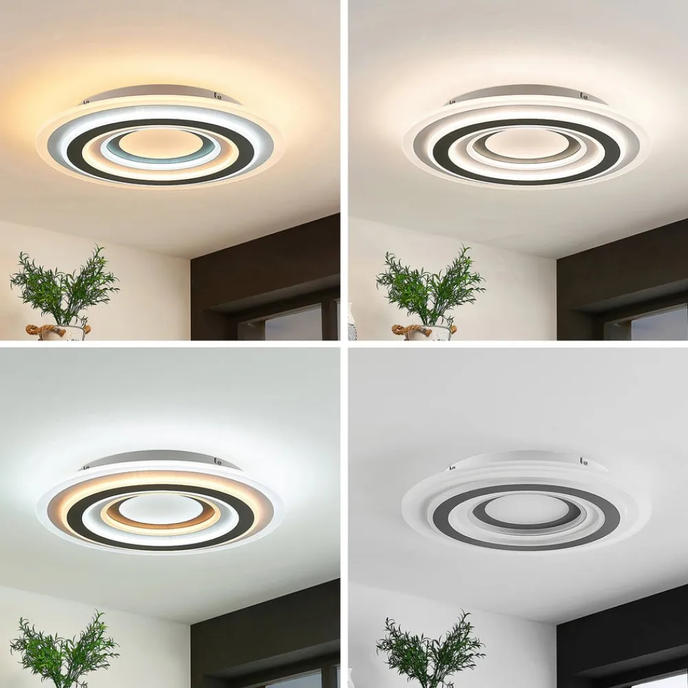 Stilfuld Jazmina LED-loftlampe lavet af jern og plast Den diskrete Jazmina LED-loftlampe pryder ethvert loft uden at overskygge resten af møblerne. Den er lavet af jern og plast og fås i en diskret farvekombination af grå og hvid. Takket være det slanke design passer den også ind i lavere rum uden at optage for meget plads. Lysfarven kan reguleres mellem varmhvid, universalhvid og dagslys ved hjælp af en fjernbetjening. Med denne praktiske funktion giver LED-loftlampen Jazmina det perfekte lys på det rigtige tidspunkt. I kombination med dens diskrete udseende er den perfekt til installation i et soveværelse eller en stue.