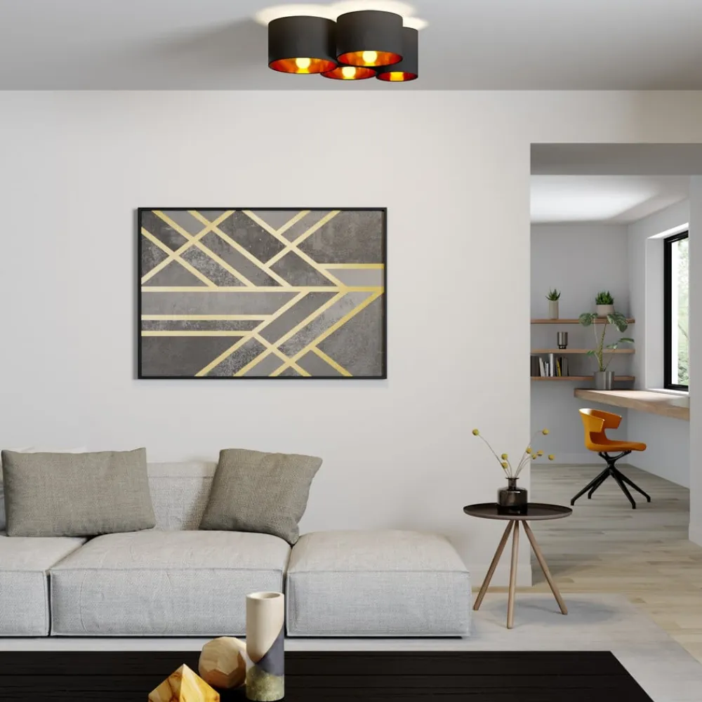 Sort og guld, 4 lyskilder Laurenz loftlampe med cylindriske stofskærme i forskellige størrelser Laurenz skaber en hyggelig stemning i hele opholdsrummet. Loftlampen har fire matsorte stofskærme, der er forskellige i størrelse og er foret på indersiden med en skinnende guldfolie. Det skaber en meget iøjnefaldende kontrast, som er en af tidens trends, og giver et varmt lys. Der kan sættes en E27-pære i hver stofskærm. Effektive LED-pærer anbefales især, og en ekstra varm lysfarve kan også anbefales til hyggelig belysning i stuen. Hvis du vil, kan du også vælge dæmpbare lamper, hvoraf nogle endda kan justeres gradvist i lysstyrke via vægkontakten uden en almindelig dæmper. Laurenz loftlampe er ikke kun velegnet til private hjem, men giver også en smukt indbydende belysning i kommercielle områder som hoteller og restauranter.