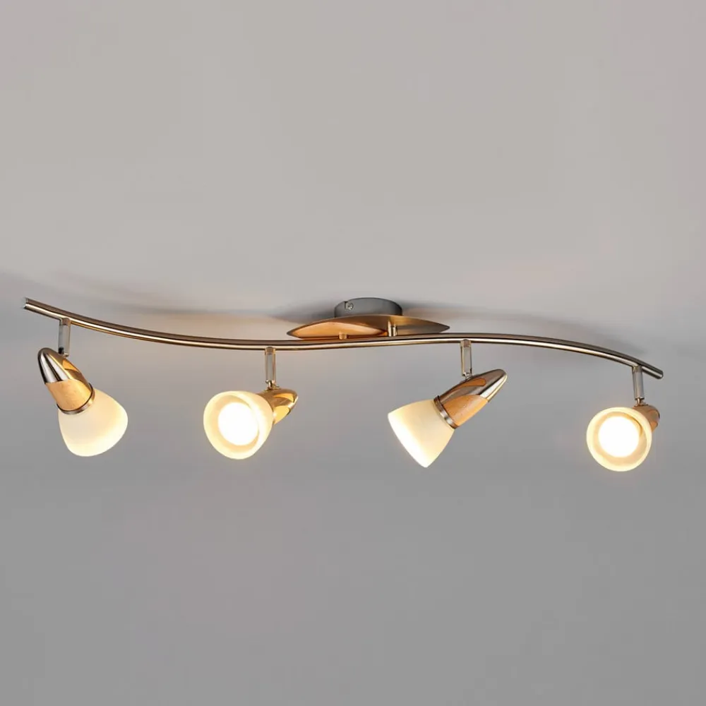 Marena loftslampe af træ og metal Marena loftslampen, som kombinerer begge materialer, viser, at træ og metal harmonerer godt med hinanden. Træelementerne findes både på loftsbeslaget og direkte på spottene, mens resten af metalrammen har en satineret nikkelfinish. Hvis Marena bruges som loftslampe, kan man opnå en god belysning.