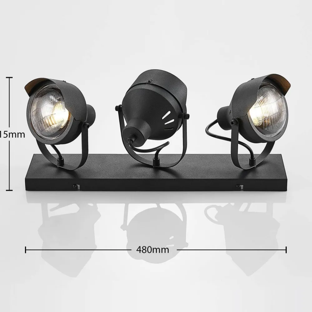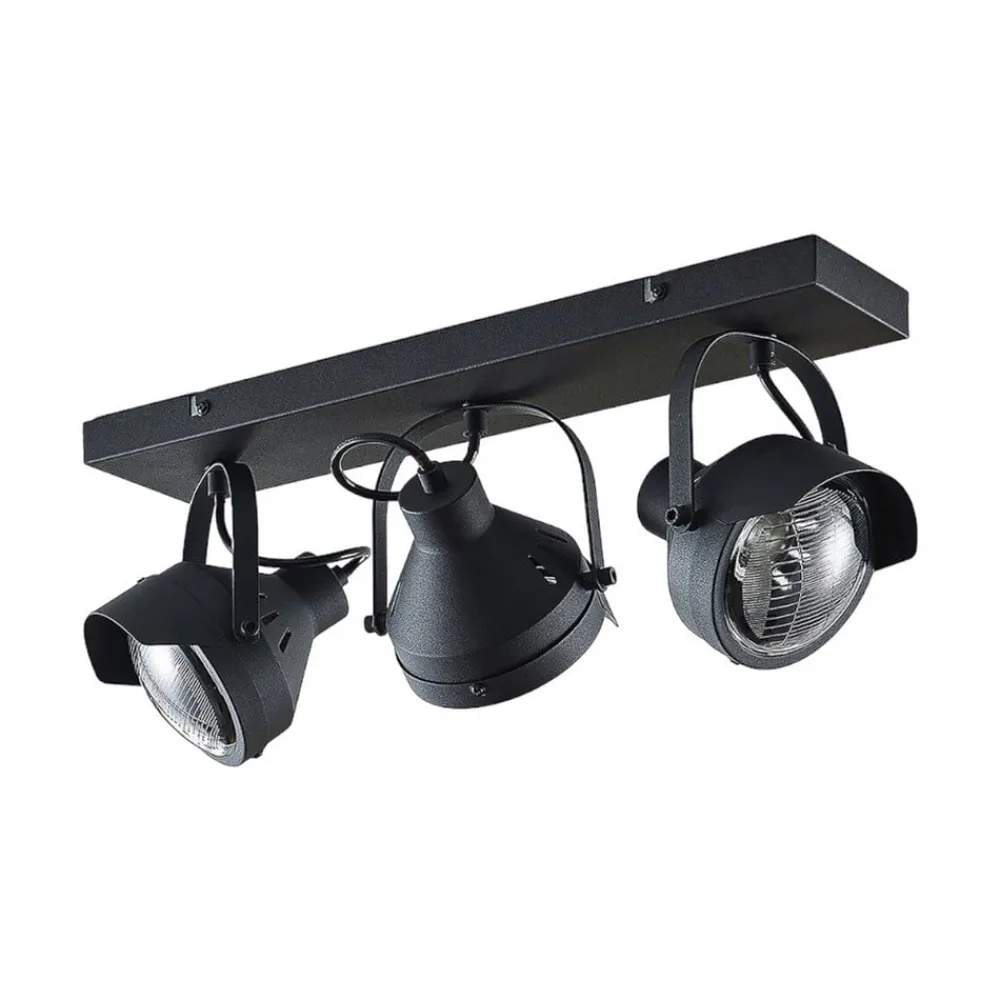 3 lyskilder Henega loftspot med tre sorte skærme i forlygte-look Henega er en lyskilde med vintage-karakter, da de tre skærme, som alle kan indstilles forskelligt, giver associationer til gamle spotlights, især dem man kender fra gamle biler. For et særligt autentisk look er glasset, der dækker pærerne, også blevet riflet. Henega hylder derfor en svunden tid, og loftlampen har et smukt nostalgisk look, som altid falder i god jord og individualiserer boligen. Et højdepunkt, der er værd at se!