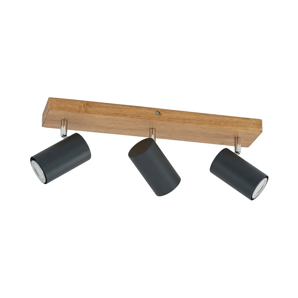 Moderne Maniva loftspot med monteringsplade af gummitræ Maniva-spottet imponerer med sit umiskendelige look, da det kombinerer forskellige farver og materialer for at skabe en harmonisk helhed. Mens loftsbeslaget er lavet af gummitræ, er de tre lampeskærme lavet af jern og udført i en klassisk sort farve. Det giver lyset en solid effekt, som blødgøres lidt af træelementet og udstråler varme. Lampeskærmene kan nemt justeres ved hjælp af kugleleddene, så lysretningen til enhver tid kan tilpasses.