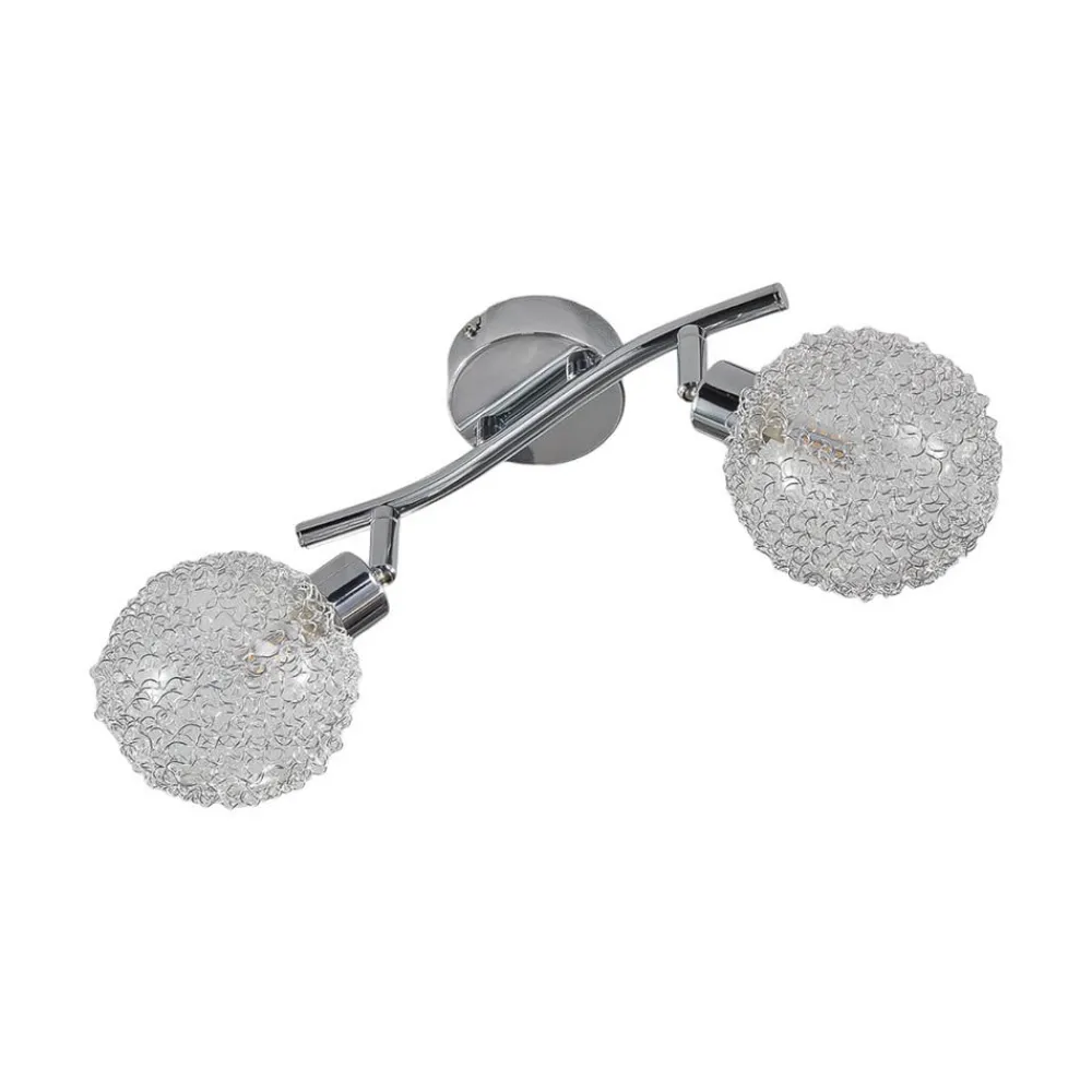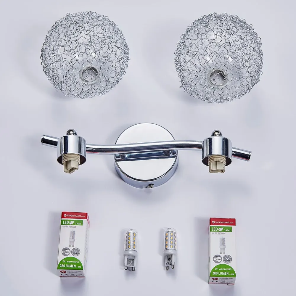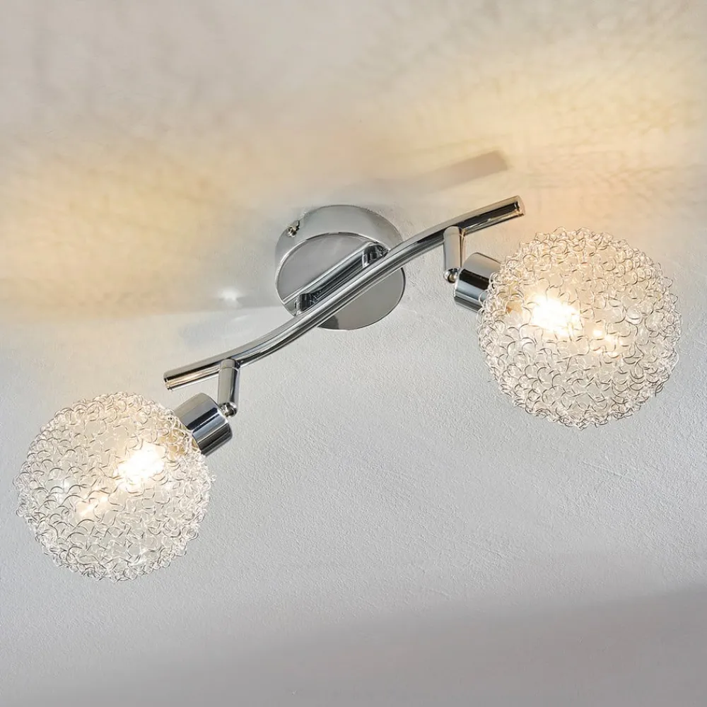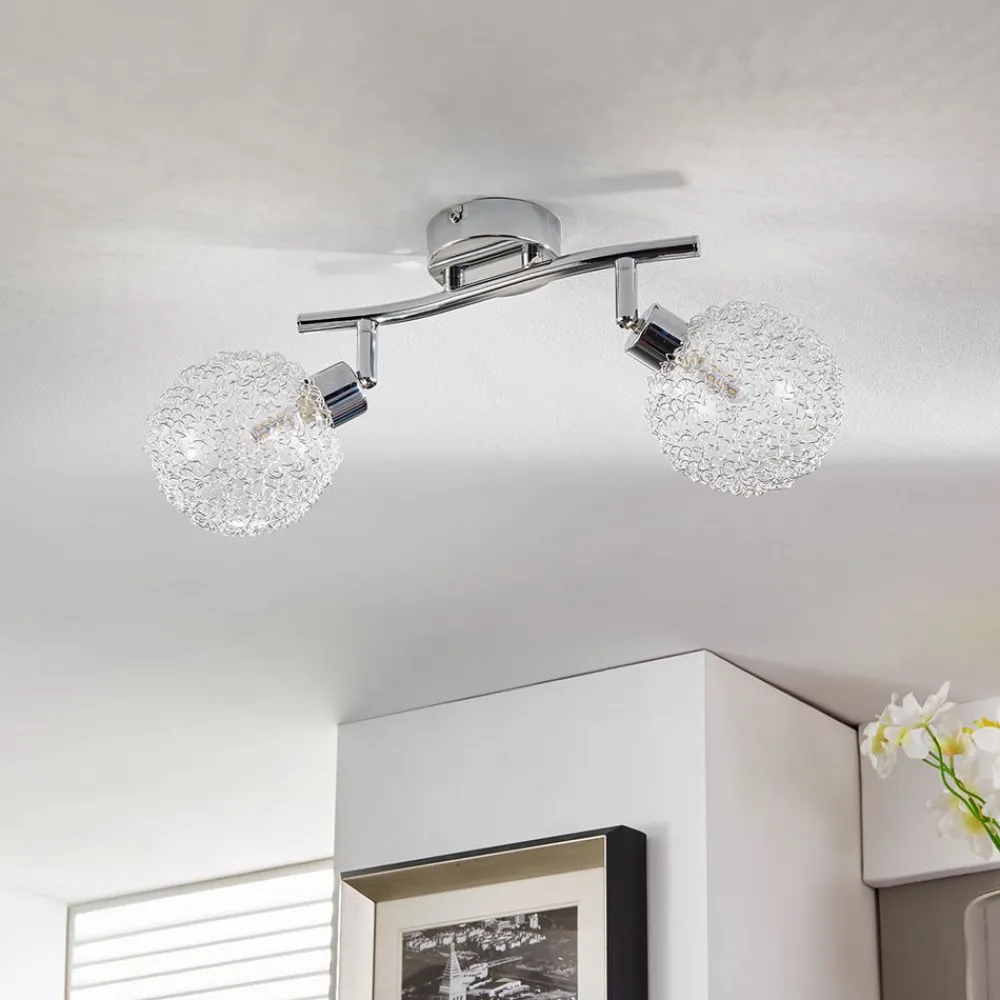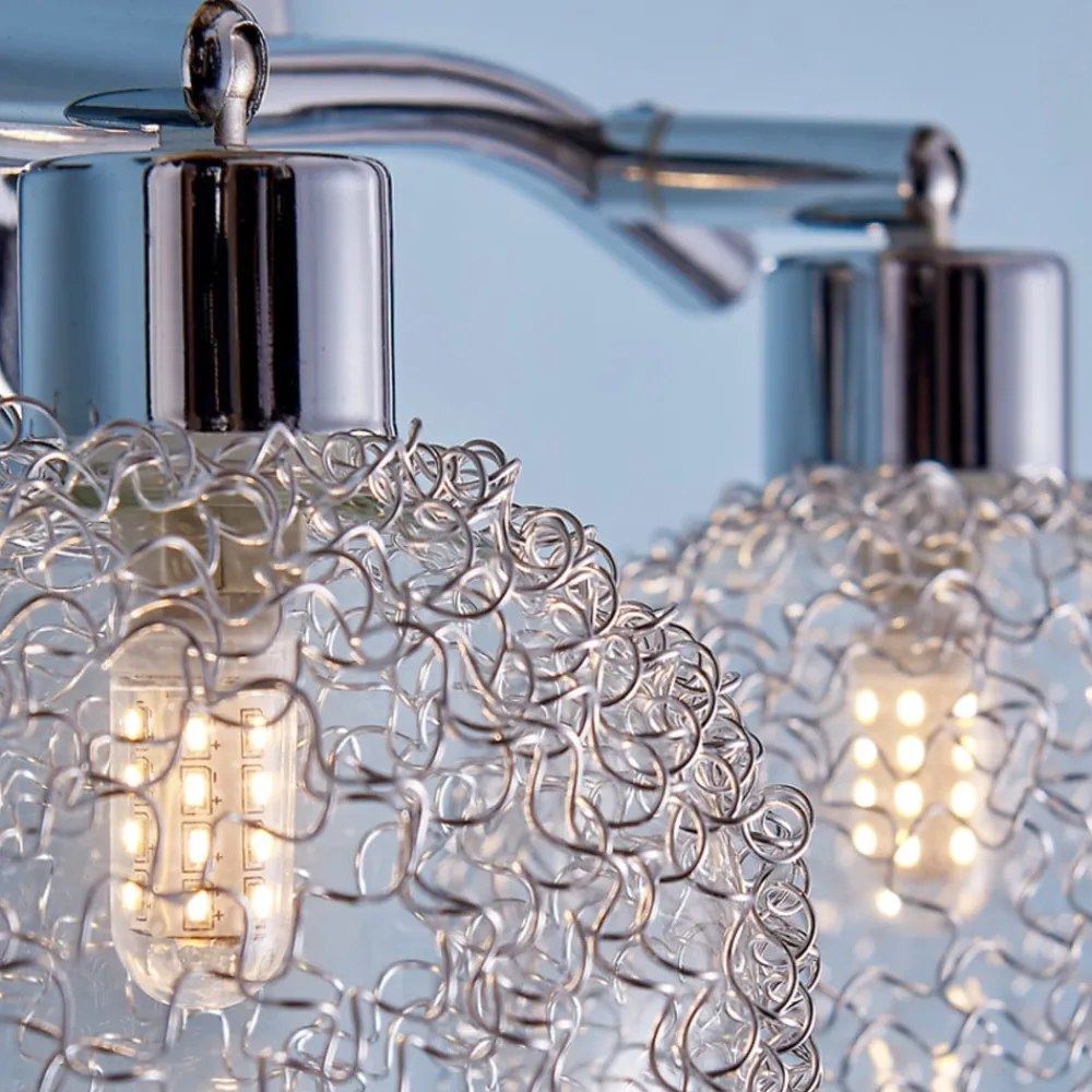 De klare, kugleformede glasskærme i Ticino loftslampen er hver især omgivet af et net af fine metalelementer. Resultatet er, at lyset er blændfrit og kommer mere jævnt ind i rummet. Alt i alt skaber det et hyggeligt og hjemligt lys, og det specielle look med sine legende træk supplerer et moderne rum på en stilfuld måde. Loftbeslaget og resten af metalrammen er forkromet, og stangens bløde bølgeform passer godt til armaturets overordnede legende indtryk. Armaturet kan monteres med G9-lyskilder