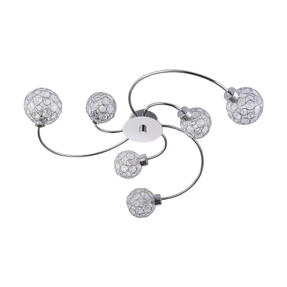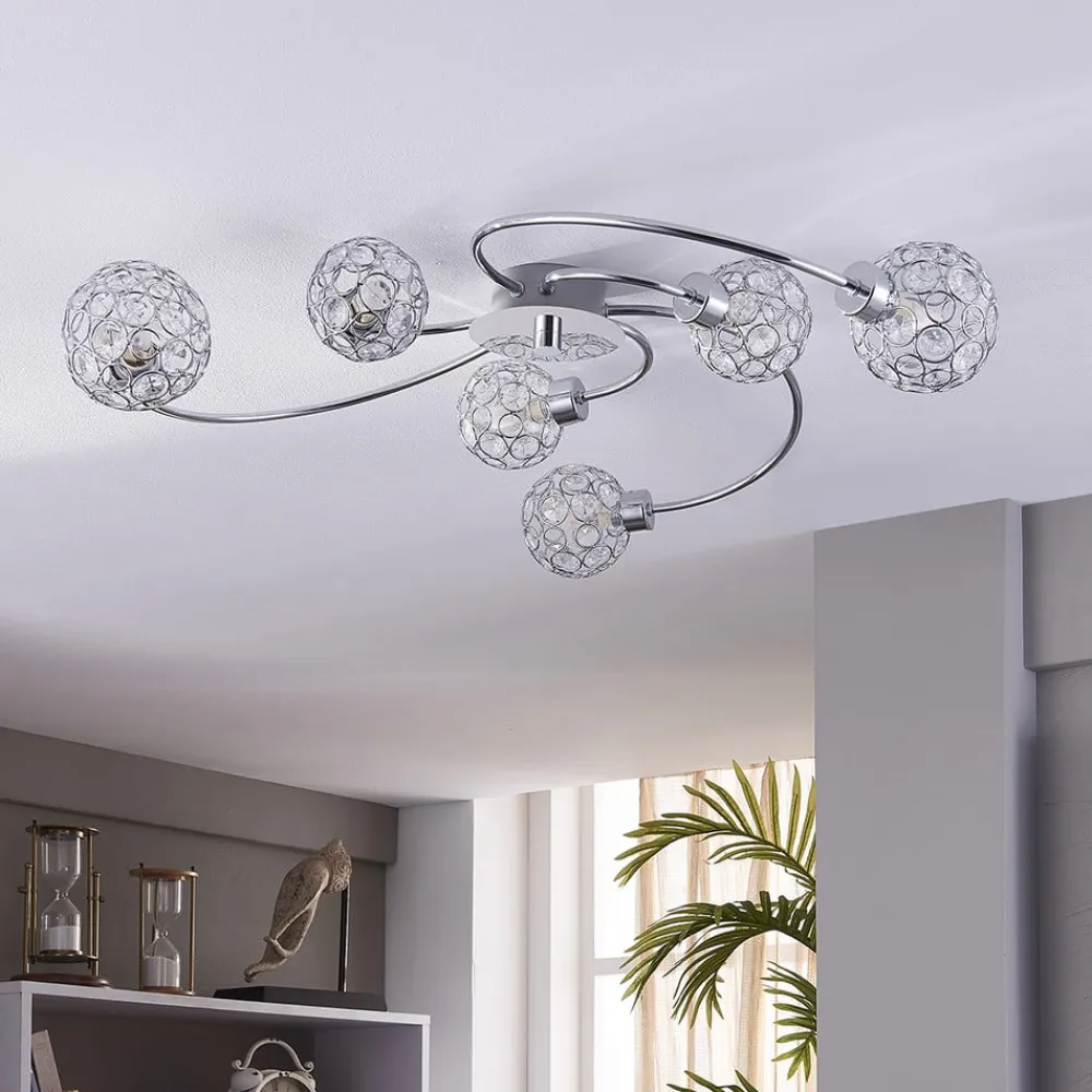 Smykkeloftlampe Tyron Tyron loftlampen formidler et særligt udtryk af symmetri og harmoni. De kugleformede skærme findes i forskellige størrelser og er lavet af metal med smukke glassten imellem. Det skaber en særlig gnist, som virkelig passer til en moderne bolig, fordi den symboliserer elegance og glamour. Den kan udstyres med passende pærer.
