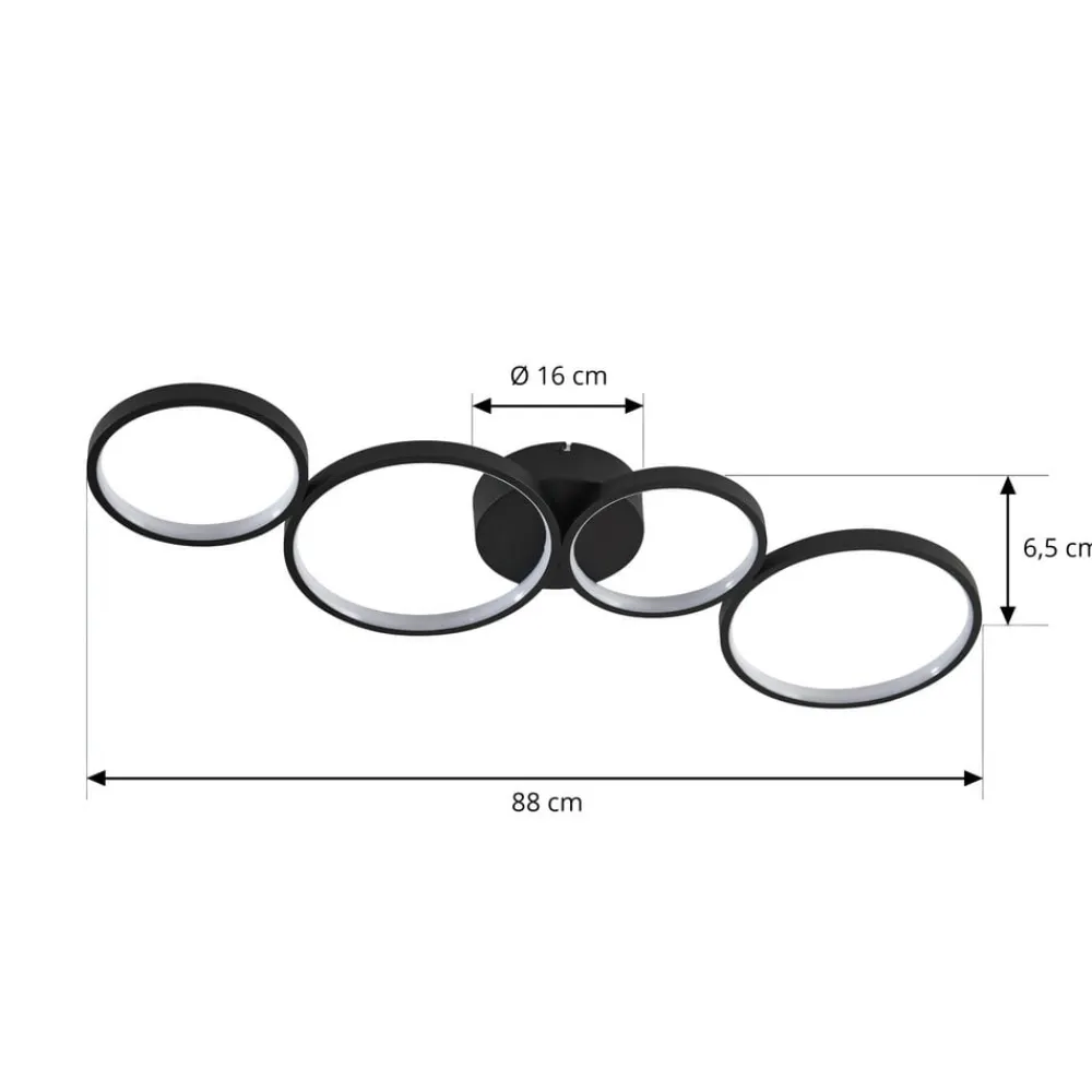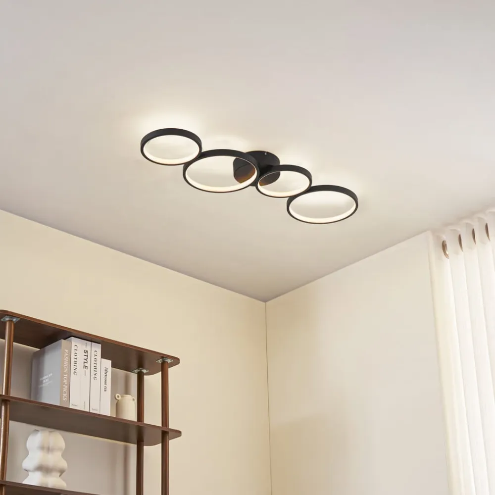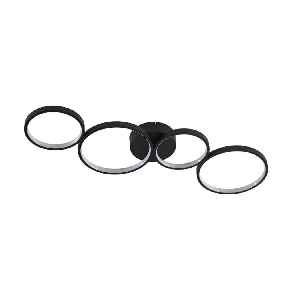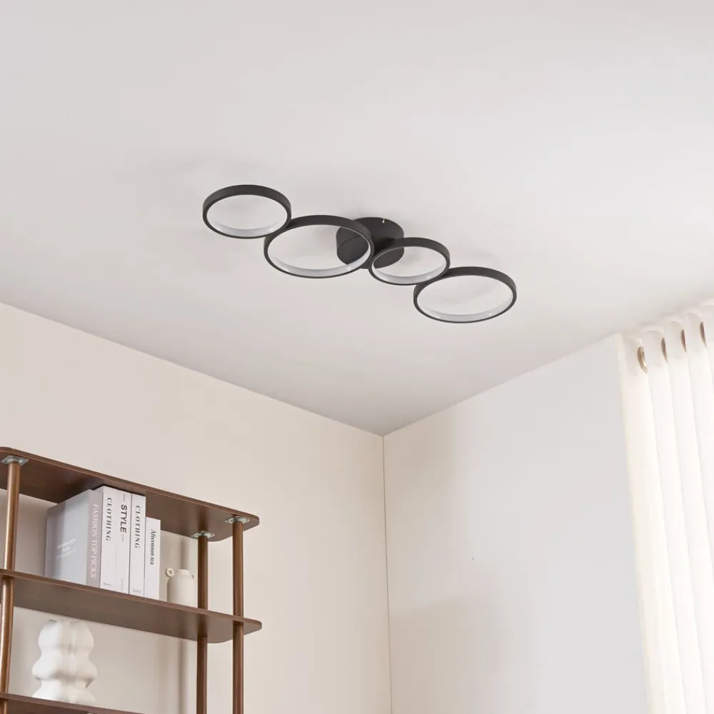 LED-loftlampen Evengeline overbeviser med sit friske og varierede udseende. Lampekroppen er fremstillet af aluminium og lakeret i sort. På loftbeslaget er der monteret fire lyscirkler, der er forskudt vandret, så der opstår en interessant form. Inde i cirklerne er der fastmonterede LED’er, som med deres runde form skaber et interessant lys, der reflekteres i cirkelformede mønstre på loftet. LED-loftlampen Evengeline forener pålidelig belysning og spændende design. Dens varmhvide LED’er skaber det rette lys til stuen eller soveværelset, mens dens spændende form sætter legesyge accenter på loftet. Takket være sin diskrete farve og slanke lampekrop kan den nemt integreres i moderne indretningsstilarter.