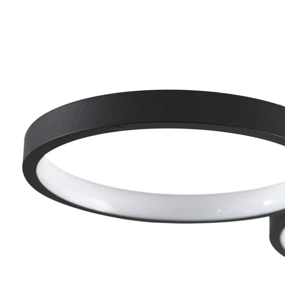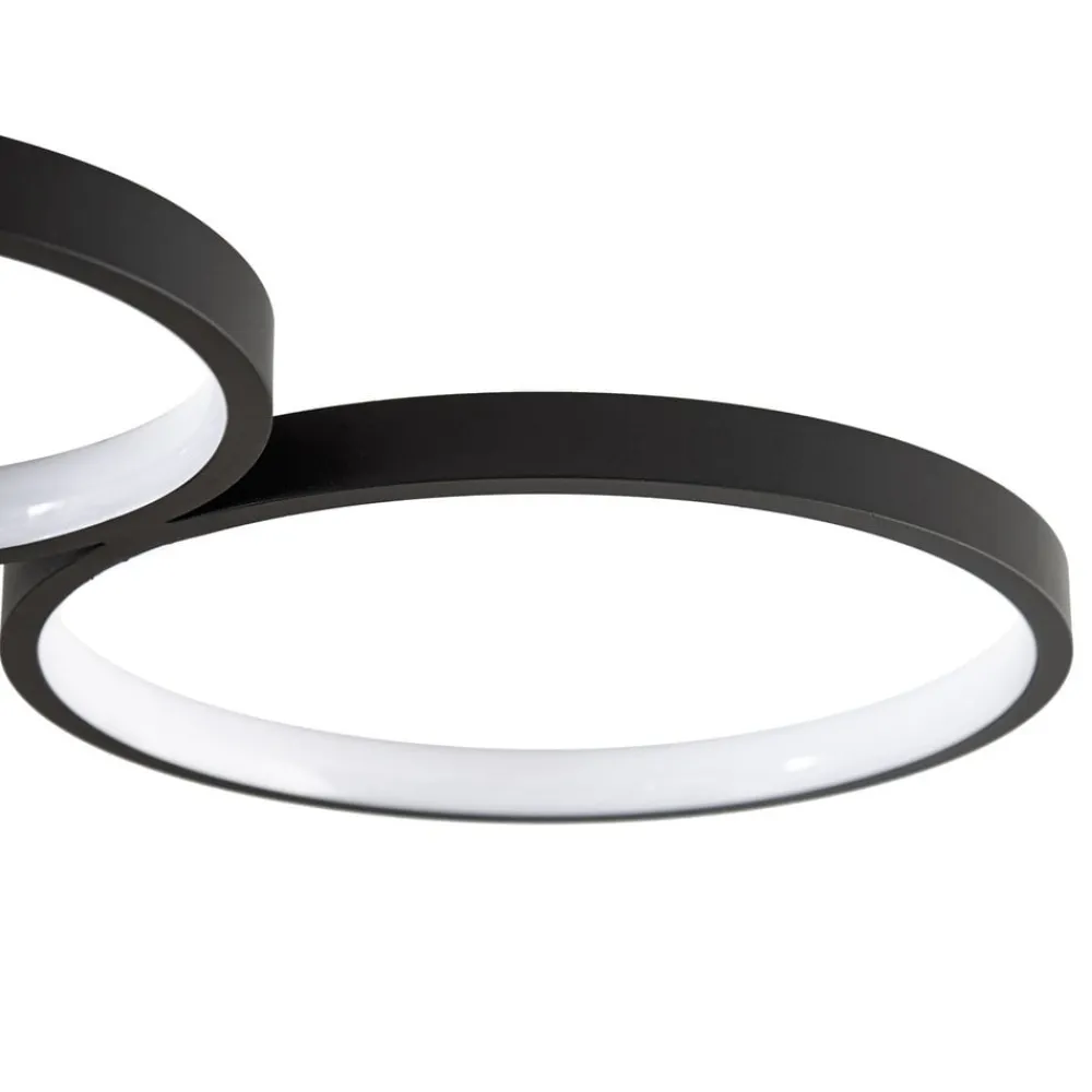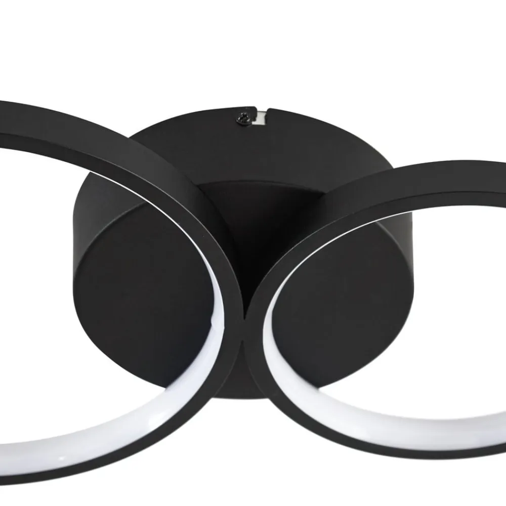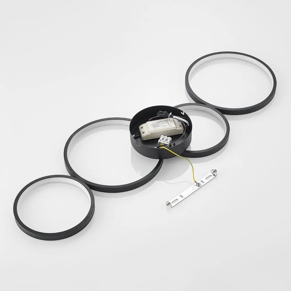 LED-loftlampen Evengeline overbeviser med sit friske og varierede udseende. Lampekroppen er fremstillet af aluminium og lakeret i sort. På loftbeslaget er der monteret fire lyscirkler, der er forskudt vandret, så der opstår en interessant form. Inde i cirklerne er der fastmonterede LED’er, som med deres runde form skaber et interessant lys, der reflekteres i cirkelformede mønstre på loftet. LED-loftlampen Evengeline forener pålidelig belysning og spændende design. Dens varmhvide LED’er skaber det rette lys til stuen eller soveværelset, mens dens spændende form sætter legesyge accenter på loftet. Takket være sin diskrete farve og slanke lampekrop kan den nemt integreres i moderne indretningsstilarter.