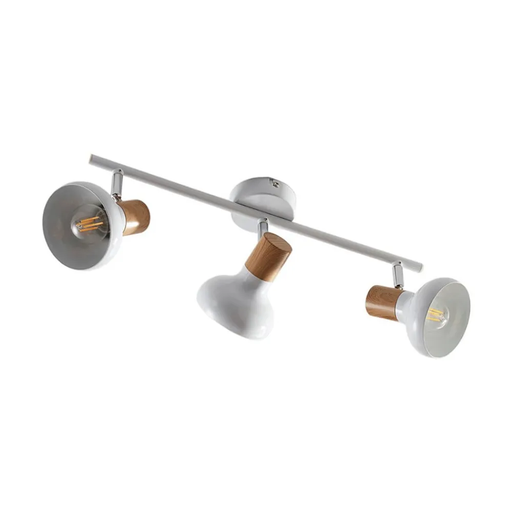 Alsidig Fridolin loftlampe af metal med tre hvide skærme og træfarvet dekor Fridolin kan give tilstrækkeligt lys til almen belysning i versionen med 3 lyskilder, og lampeskærmene kan drejes og svinges for at give en bedre lysretning. Det træfarvede lakerede element i den øverste del af skærmene er et særligt visuelt træk. Resten af skærmene er hvide, og samlet set har loftlampen et venligt udseende, hvilket ikke mindst skyldes den lyse farvesammensætning.