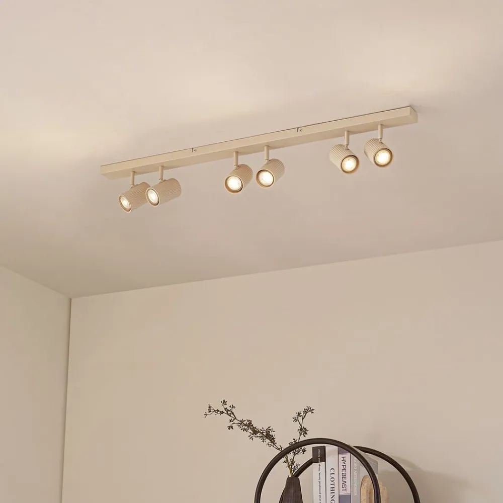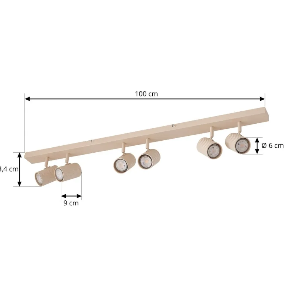 Spotlight Kardis med 6 lyskilder imponerer med sit moderne design og de anvendte materialer. Aluminiummet med den diskrete beige farve passer perfekt ind i forskellige indretningsstilarter og sætter stilfulde accenter i entreer og stuer. Konstruktionen sikrer en jævn belysning og skaber en behagelig atmosfære, som takket være de bevægelige skærme kan rettes præcis derhen, hvor man har brug for det.